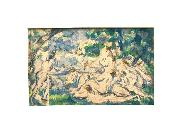 Nude Bathers, Still Life. These prints are from a portfolio, watercolor Print Lithographs from the artist Paul Cezanne: 1839-1906. Artist: Cezanne French, 1885-1890). Watercolor and pencil on paper. Title: Les Baigneuses, Year: 1947, Medium: Lithograph, Edition: 194/500, Works On Paper Montage. The contribution made by Paul Cézanne's work is unequalled in the history of 20th-century art and painting. It was pivotal and left its imprint on artistic movements which were as seminal as they were diverse: Cubism, Fauvism and Abstraction. Treating each aspect of his compositions with the same thoroughness, refusing to impose any hierarchy on his subjects, Cézanne was the source of a new representation of perspective which his successors would use to open the floodgates of Modern Art. "Cézanne went solely towards the abstraction of natural bodies. recognised as key masterpieces, "among the most difficult works of art [to access] and yet the most powerful in the history of the early 20th century We know that Cézanne undertook a number of studies and drafts of "women bathing beneath the trees, in a field", this "subject which haunted him". "Most are pencil sketches which would not leave the chest-of-drawers in his bedroom or the draw of the table in his studio, testifying to his tenacity and even a certain determination to address the theme". There are currently only a small number of studies catalogued, however, that reflect the same composition as in the final versions, notably including seven studies. There are sets of watercolours, a large majority of which are now owned by public institutions. By addressing the theme of male bathers on the 1870s, and then female bathers a decade later, Cézanne follows in the long 17th and 18th century tradition of mythology and Classicism, placing nudes in open-air compositions in the manner of Titian or Poussin. However, while the artist seems to find inspiration in a Classical theme, he nevertheless offers a complete and very personal reinterpretation of it. In these prints, he attempts to achieve perfect harmony, the merging of figures and natural elements, both through his use of tone and form. The importance given to the landscape, both in terms of the space allocated to it and the special attention paid to the tonality of the water, sky and foliage, creating a feeling of depth with the greatest possible minimalism, is reminiscent of his work. Most of this work, which has remained unknown to the general public until now.