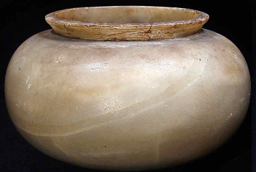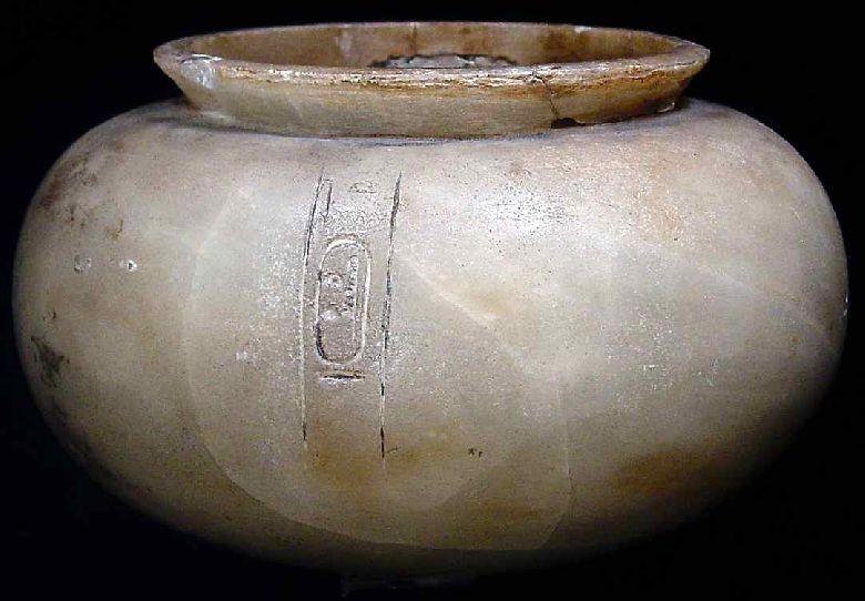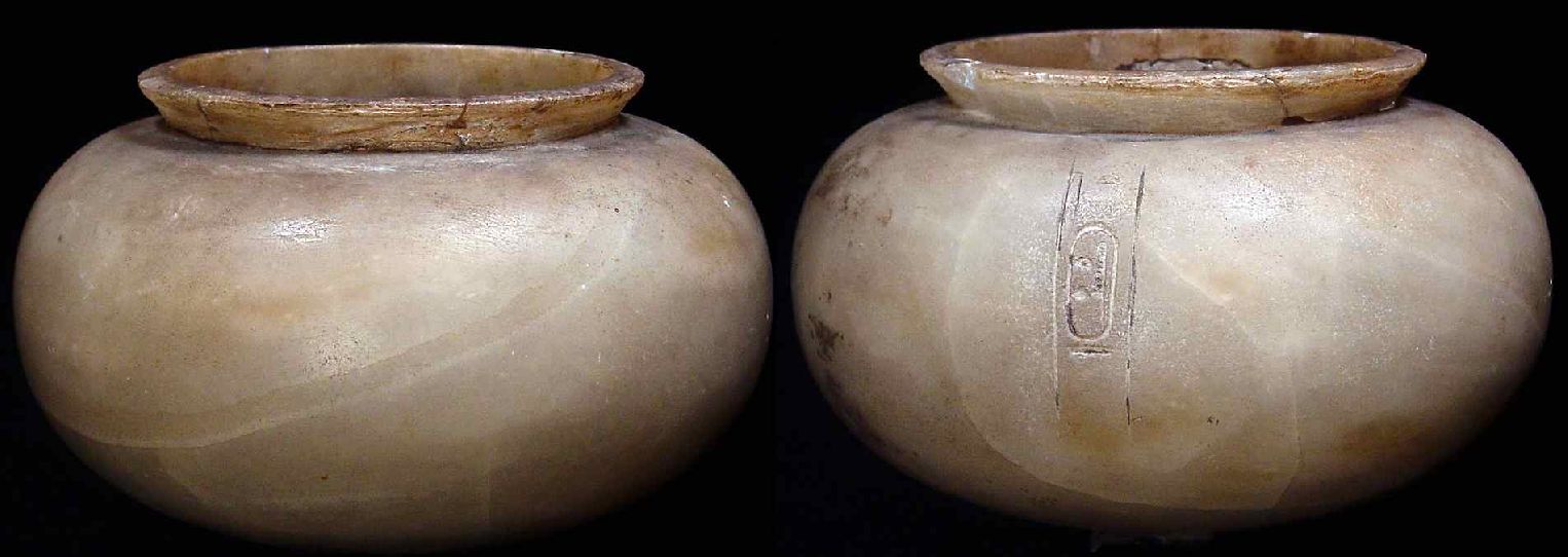 EGYPTIAN OLD KINGDOM ALABASTER BOWL WITH LATER CARTOUCHE. 3rd Dynasty, c. 2683-2613 BC. Provenance: McGregor Collection. Old tag on bottom gives find spot. Minor repair to rim, stable age lines at bottom. 5 x 8 inches. Very rare. A similar alabaster bowl without the rim can be found in the collection of the Field Museum of Chicago.