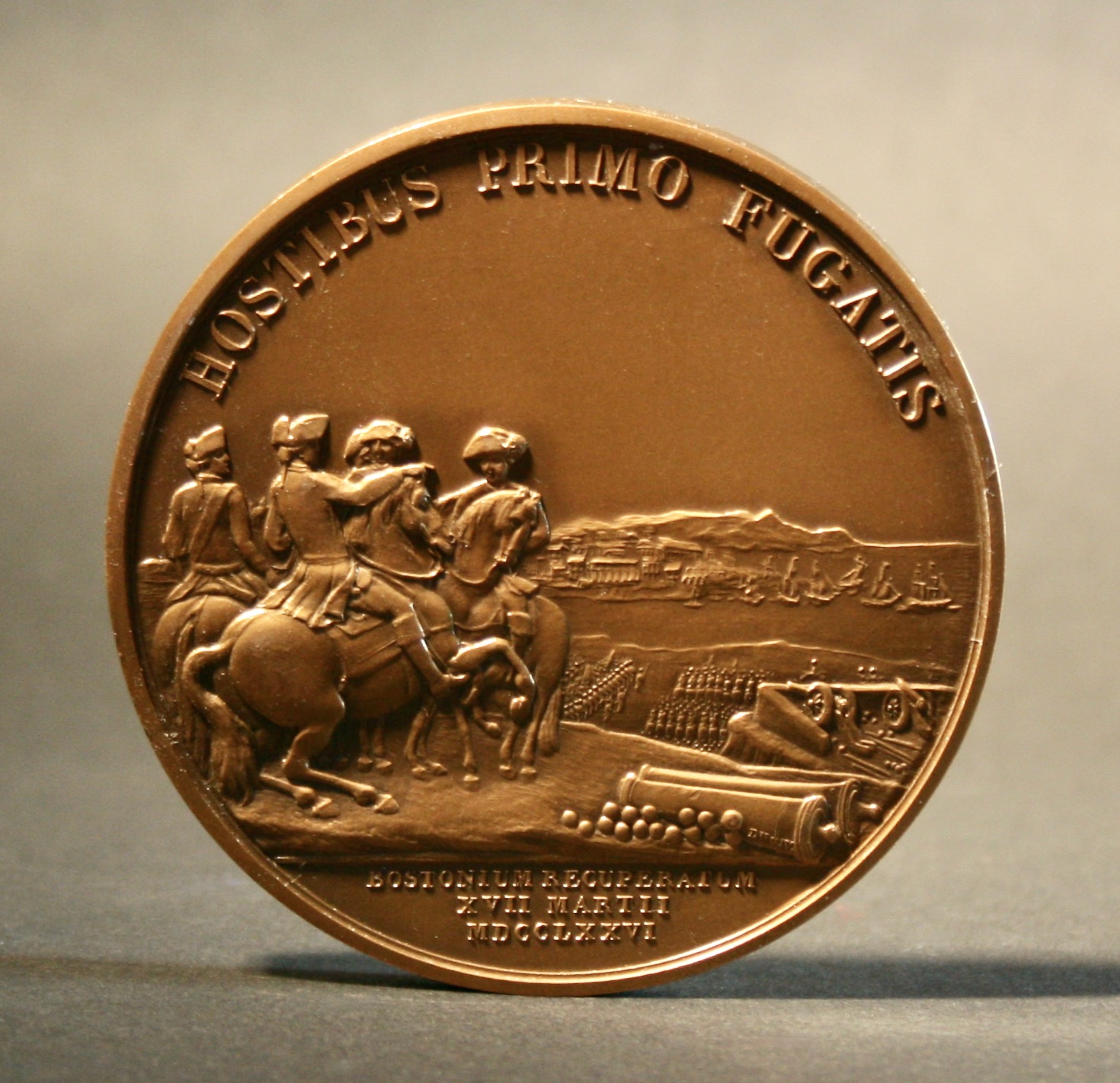 General George Washington The Evacuation of Boston, March 17, 1776. The Washington Before Boston Medal has become the most popular of all Revolutionary War medals among collectors. This is one of 50 to 60 known examples of Washington before Boston medal in bronze that was struck from the original dies. (Cited from: Description of U.S.A. Bronze Medal Commemorating George Washington Before Boston, 1776 (1900-2000): This medal, crafted in bronze and adorned with gilt, features an obverse design depicting a dignified bare head of George Washington facing right. Below the image of Washington, the inscription reads, "GEORGIO WASHINGTON SVPREMO DVCI EXERCITVVM ADSERTORI LIBERTATIS." On the same side of the medal, beneath the inscription, we find "COMITIA AMERICANA." The reverse side of the medal showcases a compelling scene with four equestrian figures set against a backdrop of Boston Harbor, with a cannon positioned to the right. Above this imagery, the Latin inscription "HOSTIBUS PRIMO FUGATIS" is displayed. In the exergue, the medal carries the following text: "BOSTONIUM RECUPERATUM / XII.MARTII . MDCCLXXVI." Provenance: This exceptional medal was presented to Her Majesty The Queen by Mr. Eliott Richardson, the United States Ambassador, and was delivered via William Heseltine. Following “the shots heard around the world” at Concord Bridge in April 1775, a diverse group of American militiamen and minutemen surrounded the British forces in Boston. In June the British launched a major attack on the American fortifications at Breeds and Bunker Hills. Although the British won the battle after the Americans ran out of ammunition, their victory came at a staggering cost. Over of a thousand of the 2,200 soldiers in the attacking force were killed, and many more were wounded. Not long after the Battle of Bunker Hill the Continental Congress appointed George Washington as General-in-Chief of the Continental Army. After consolidating his position Washington devised a plan to end the Siege of Boston. He sent Henry Knox to Fort Ticonderoga in northeastern New York State to bring back cannon from that recently captured facility. After fighting bitter cold and occasional thaws that made travel difficult, Knox and his party returned to Boston with 59 pieces of ordinance of various calibers. On the night of March 4, 1776, while the British responded to random cannon fire and other distractions, the colonials built breastworks on Dorchester Heights above the Boston Harbor. At dawn the British awoke to find that their military position had become untenable quite literally overnight. Now their only lifeline, the British Navy, could be attacked atany time by the cannon that were now trained on Boston Harbor. After a freak storm thwarted a token effort by the British to dislodge the Dorchester cannon, the British evacuated Boston on March 17, 1776. A week later Congress voted to award a gold medal to George Washington for this triumph. Washington would not receive his prize until 1790 which was a typical delay for those who would be awarded Revolutionary War medals. In the grand scheme of things, Washington’s victory over the British in Boston was not of great strategic significance. The British retired to Nova Scotia where they regrouped and returned with a vengeance to fight the war for another five years. Still the evacuation of Boston did build American morale, and it demonstrated that the colonists did have a chance to win their Independence. The Washington Before Boston Medal has become the most popular of all Revolutionary War medals among collectors. To date at least eight different die combinations have been used to strike examples of this piece at the Paris and Philadelphia Mints. The Boston Public Library now holds the gold medal that was awarded to Washington.