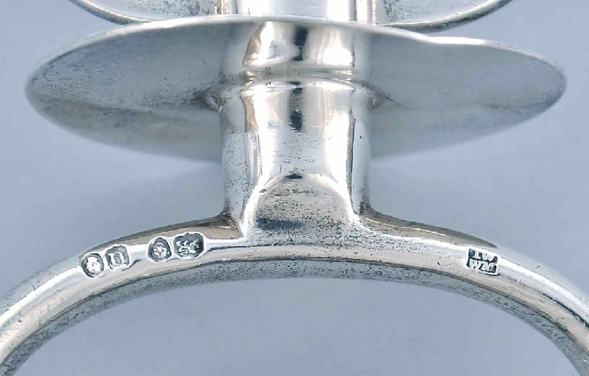 The ovoid handle with a foliate relief design at the top, hallmarks on the lower portion for London, ca. 1835, stem with a disc in the center and two prongs, approx. 9-1/2"L. Unidentified maker's mark . Weighs approx. 12.63 troy oz. Condition: Minor scuffs and dents from use and polishing.
