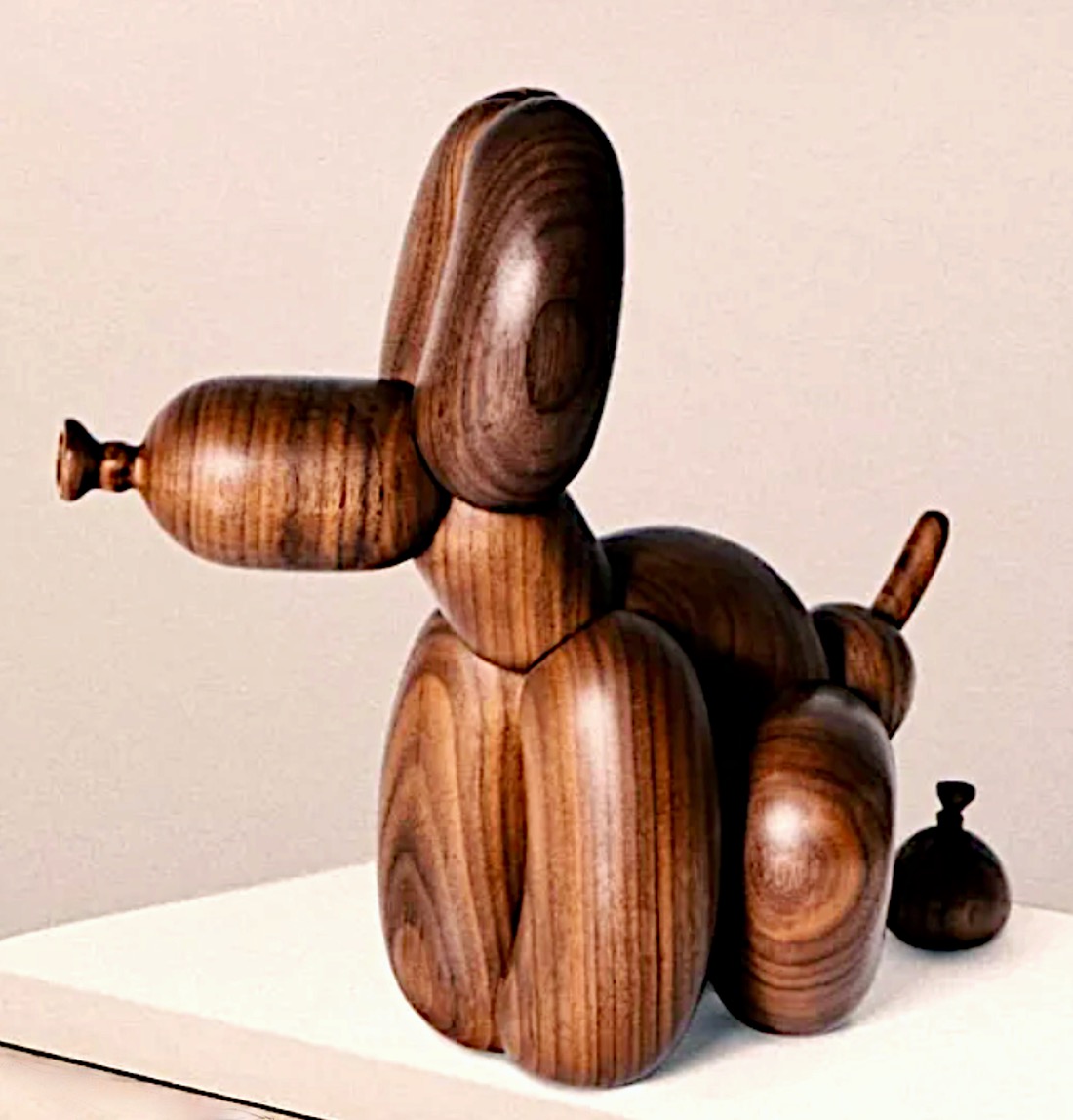 Consignment: shipping can take up to six weeks. Please verify availability. Decorative interpretation / This unique, custom-made, handcrafted contemporary wooden sculpture is a delightful interpretation of Jeff Koons' iconic balloon dog. The wooden balloon dog ornament serves as both artwork and a unique piece of furniture, perfect for decorating your living room. Koons, known for challenging artistic norms, explores the intersection of humor and art in this piece. By taking the whimsical and playful balloon dog and infusing it with a cheeky and unexpected element, he invites viewers to question conventions and embrace the unexpected. The sculpture becomes a commentary on the collision of the ordinary and the absurd, challenging perceptions and provoking thought with its humorous and thought-provoking narrative. Koons' daring approach to art leaves an indelible mark, encouraging us to reconsider the boundaries of creativity and find amusement in the unexpected twists of life.