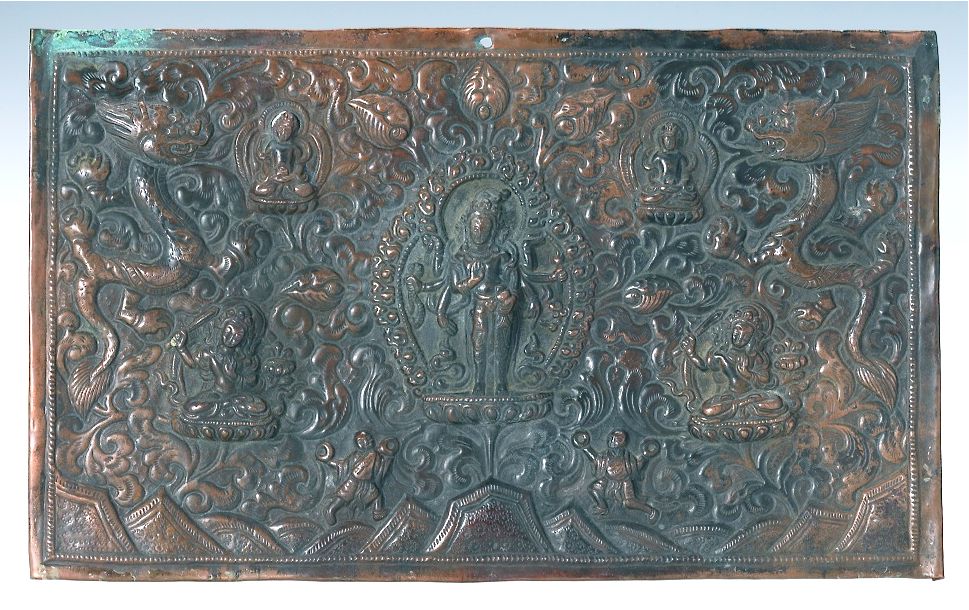 Title: Tibetan Repousse Antique Plaque Copper Buddha Plate & Dragons