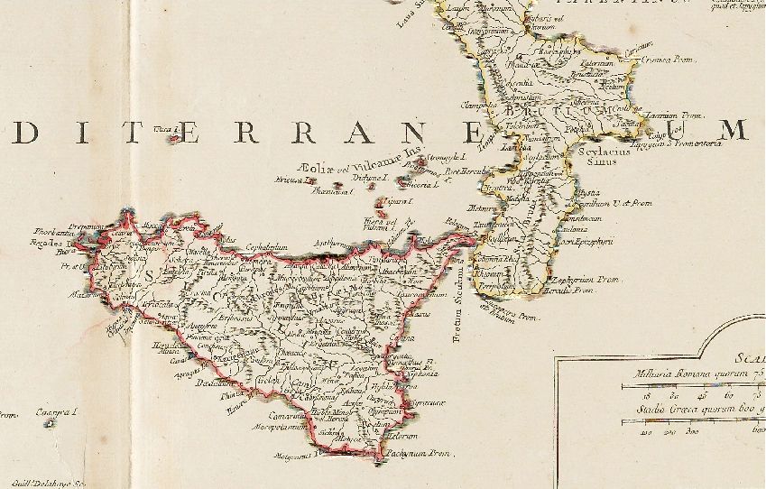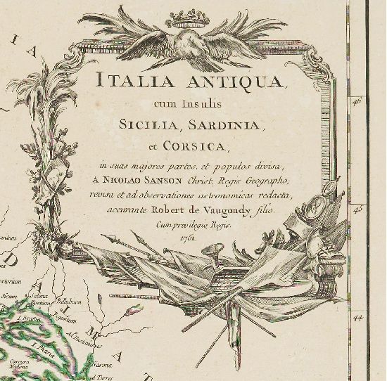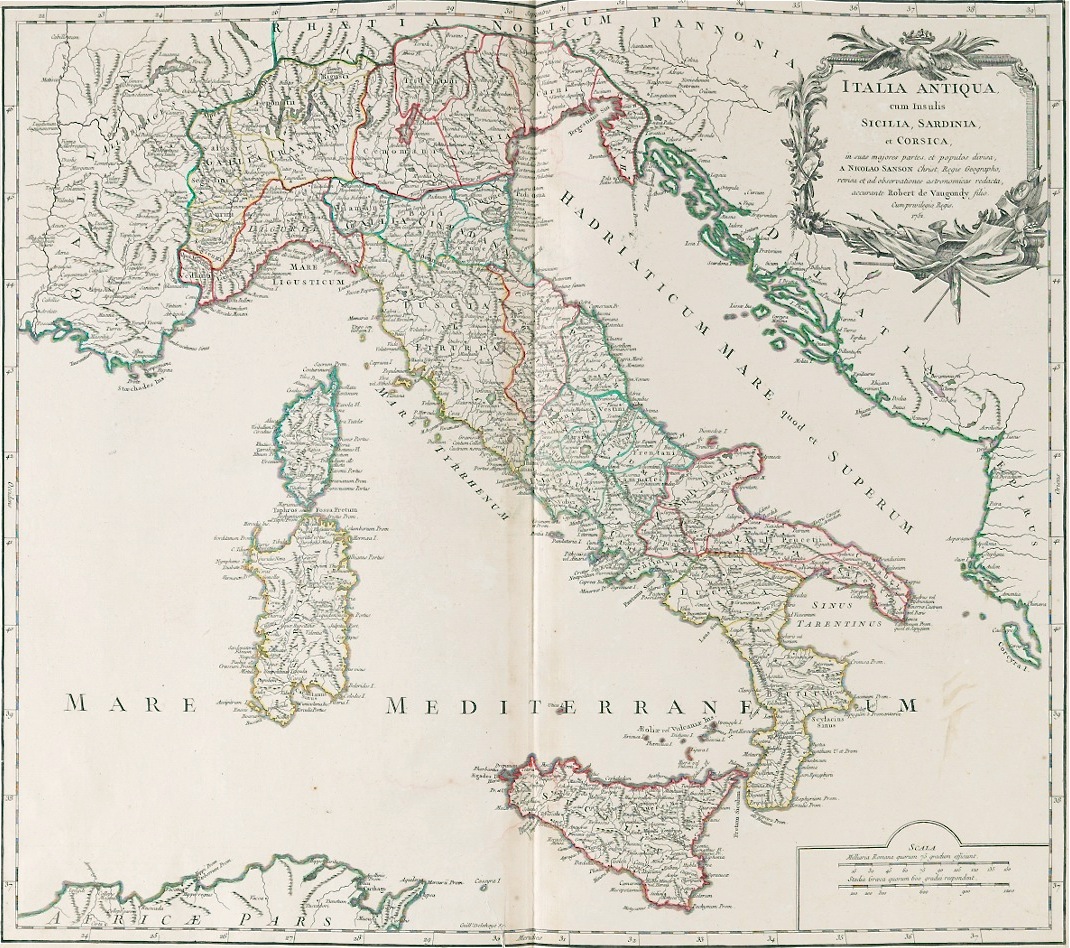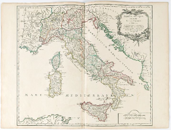 This wonderful large vintage map of Italy, can be used as elegant frame wall art. This has been engraved and Printed on handmade antique paper. 18th Century. "Italia Antiqua Cum Insulis Sicilia, Sardinia et Corsica..." by Sanson & DeVaugondy: 19-1/2"T x 26-1/2"W paper size: Paris, 1751, Robert de Vaugondy, Didier, 1723-1786; Robert de Vaugondy, Gilles, 1688-1766; Sanson, Nicolas, 1600-1667. Copper plate engraved map on chain lined paper, having antique hand coloring, decorative title cartouche in upper right corner and scale in lower right. Plate impression 19-1/2" x 22". Condition: Faint toning at perimeter, very good. We are committed to enhancing our customer’s lives by discovering creating, and pointing out only the best art we can find in the world today. We Are Taste-Makers, Art Advisers & Consultants.