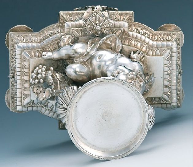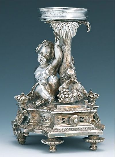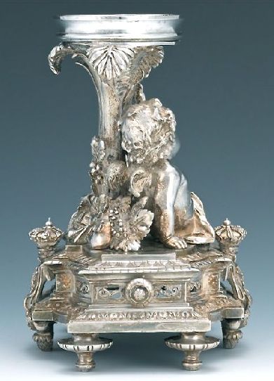 Sterling Silver Sculpture Cherub Reclining Putto Angel Centerpiece / Absolutely gorgeous work! A silver figural of a cherub or putti is a spectacular antique sculpture. A Silvered Bronze Cherub Compote Base, 19th Century: 7"T x 6"W x 4-1/2"D A very well cast silvered bronze base to a compote or stand, depicting a reclining putto amongst grapes and instruments on shaped stepped base with regal monogram on crowned shield, raised on feet, reserve on the side with raised initials. Palm frond stem holding a round base for a vessel. Unmarked. Condition: Some wear to silver, round top reattached and not even as depicted. Overall excellent condition. We are committed to enhancing our customer’s lives by discovering creating and pointing out only the best art we can find in the world today. We Are Taste-Makers, Art Advisors & Consultants.