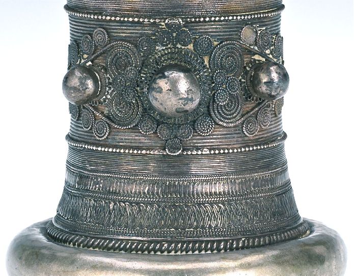 A Spectacular Old Handmade Tribal Cuff Bracelet: 5"L x 4"D opening appox. 2-3/8" Tribal solid bronze cuff bracelet with chased and decorated applied wire, silver plated. ca. 1800 to 1900's. Condition: Age wear. The decorative techniques during this period were fabulous as ornamentation appeared everywhere with this kind of jewelry. Medium to heavy weight. This is very old ethnic tribal costume jewelry. We are committed to enhancing our customer’s lives by discovering creating, and pointing out only the best art we can find in the world today. We Are Taste-Makers, Art Advisers & Consultants.