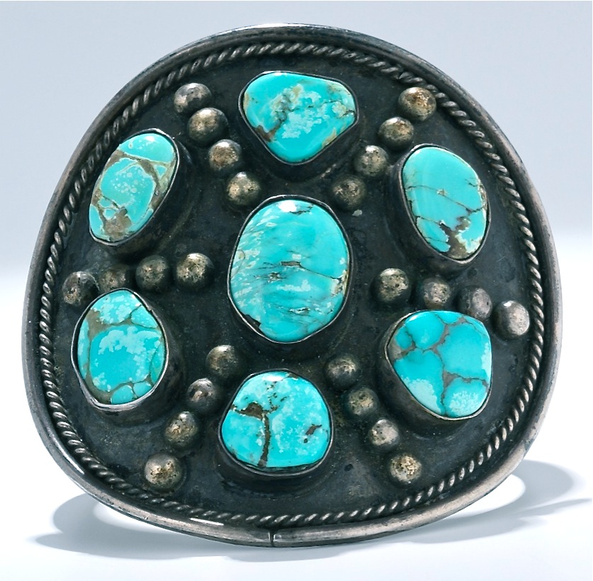 A true collector's item, this American Indian bracelet features five turquoise stones beautifully offset in sterling silver. This is a great bold color for a bracelet that makes a statement. The distinctly Southwestern styling and detailed sterling silver provide a perfect framework for blue-green turquoise stones. A Sterling Silver and Turquoise Cuff Bracelet: 2-1/2"H x 2-1/4"W Sterling silver cuff bracelet designed as a disk, set with seven turquoise nuggets; unsigned; overall weight 76.5 gm. Condition: Light surface soils. We are committed to enhancing our customer’s lives by discovering creating, and pointing out only the best art we can find in the world today. We Are Taste-Makers, Art Advisers & Consultants.