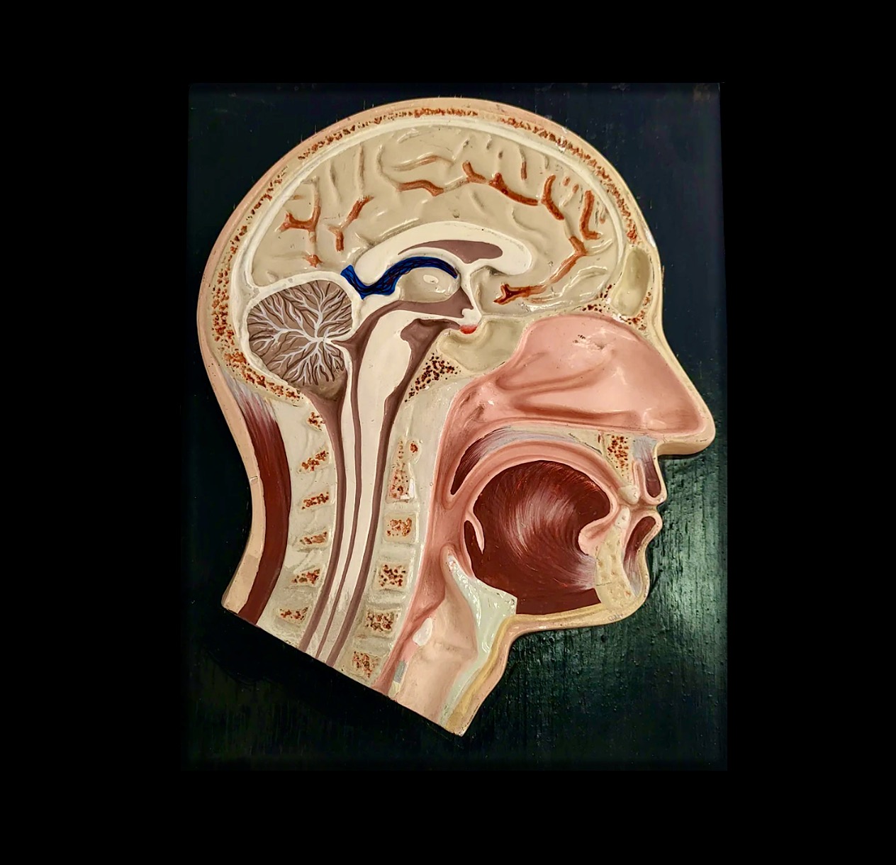Consignment / please contact me for availability and price / Step right up and witness the marvel of a bygone era—a super cool antique anatomical model! Behold the intricacies of the human head captured in a cross-sectional masterpiece. This isn't just any display; it's a training model, a relic from the world of medical education. Crafted with care and precision, this massive plaster wonder was lovingly handmade in 1948 in Bulgaria, a testament to the craftsmanship of a bygone era. Mounted proudly on a sturdy wooden base, it stands at a majestic height of 30 cm, spreading its wisdom with a width of 23 cm and a depth of 2.5 cm. Each detail is meticulously preserved, it's a tangible piece of history that allows you to travel back in time and appreciate the artistry that went into medical education. But wait, there's more to explore! Dive into the world of antique decor as you browse through the captivating photos, all authentic and waiting to transport you to a time when medical training was a hands-on affair.