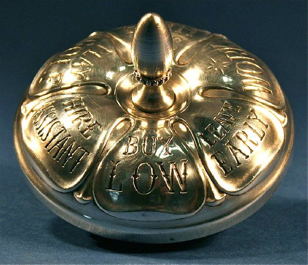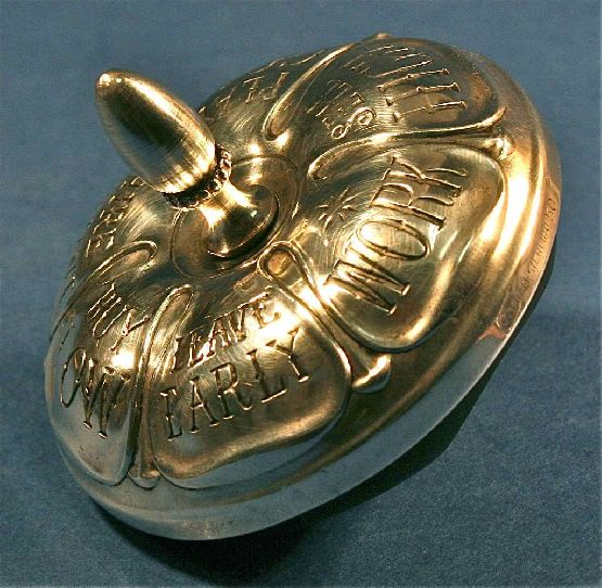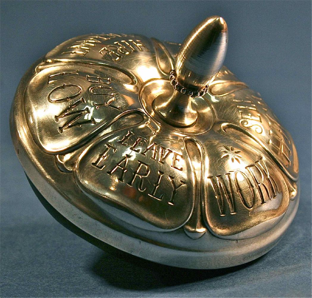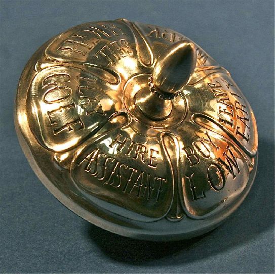 Being offered is a fine antique circa 1930 1940 sterling silver and ebony toy 'top' by Gorham of Providence, RI, that will help you spin your fortune. Here is a vintage Gorham sterling silver and ebony bottom executive decision making spinning top. On the top has impressed decision options "Play Golf", "Hire Assistant", "Buy Low", "Leave Early", "Work", and "Sell High". Vintage Antique Gorham Sterling Golf Spinning Top Xmas Ornament Toy. This is a hard to find~great looking 3D classic toy ornament. Super find for your 3D ornament collection or your classic toys ornament display, or a special gift for your favorite golfer! Ornate design, sterling silver spinning Golf top toy made by Gorham is a working top. This is properly hallmarked Gorham Sterling 50. It measures 2 3/4 inches in diameter and 2 1/2 inches tall. Although designed by Gorham as a toy, the top has become popular with sterling silver Christmas ornament collectors. The top is in excellent condition. Gorham's specialty, producing high-quality sterling silverware and holloware. In the early 1880s Gorham began casting ecclesiastical items, such as lecterns and in 1889 the cast their first statue, The Skirmisher by Frederick Kohlhagen, located at Gettysburg National Military Park. In 1896 their casting of W. Granville Hastings bust, Judge Carpenter was the first in America using the lost-wax casting method. After that the foundry went on to become one of the leading art foundries in the United States. A 1920 book published by the Gorham Company featured full page photographs of sculptures by such notable sculptors. The Smithsonian archives of American art list Gorham foundry over 700 times in their inventory of American sculpture. We are committed to enhancing our customers lives by discovering creating, and pointing out only the best art we can find in the world today. We Are Taste-Makers, Art Advisers, Consultants & Publishers of Great Stories.