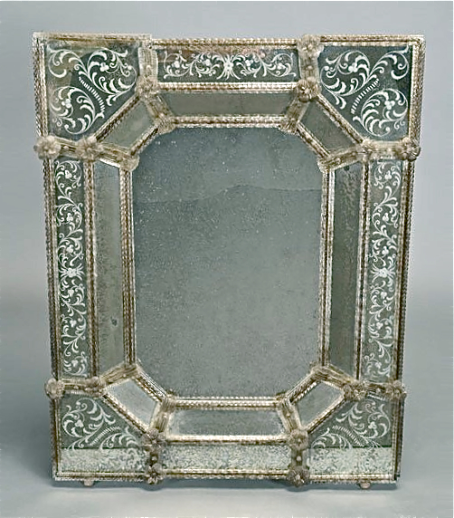 This Is A Fantastic Venetian Chamfered and Paneled Wall Mirror, the rectangular form mirror panel with chamfered ends mounted within a sectional paneled border with scrolling leafy vine and flowers, fitted with corner rosette form paterae and ribbon form spandrels, the trim and rosette paterae in smoky topaz glass. 19th Century; {Dimensions 40 x 30 inches} The process of making Murano glass is rather complex. The glass is made from silica, which becomes liquid at high temperatures. As the glass passes from a liquid to a solid state, there is an interval when the glass is soft before it hardens completely. This is when the glass-master can shape the material. The other raw materials, called fluxes or melting agents, allow the glass to soften at lower temperatures. The more sodium oxide present in the glass, the slower it solidifies. This is important for hand-working because it allows the glassmaker more time to shape the material. The various raw materials an artisan might add to a glass mixture are sodium (to reduce melting temperature), nitrate and arsenic (to eliminate bubbles) and colouring or opacifying substances. Colours, techniques and materials vary depending upon the look a glassmaker is trying to achieve. Aquamarine is created through the use of copper and cobalt compounds, whereas ruby red uses a gold solution as a colouring agent. Murrine technique begins with the layering of coloured liquid glass, which is then stretched into long rods called canes (caneworking). When cold, these canes are then sliced in cross-section, which has the layered pattern. The better-known term millefiori is a style of murrine that is defined by each layer of molten colour being shaped by a mold into a star, then cooled and layered again. When sliced, this type of murrine has many points, thus mille (thousand) fiori (flowers). Filigree (a type of caneworking), incalmo, enamel painted, glass engraving, gold engraving, lattimo, ribbed glass and submersion are just a few of the other techniques a glassmaker can employ. Murano artisans use specialised tools in the making of their glass. Some of these tools include borselle (tongs or pliers used to hand-form the red-hot glass), canna da soffio (blowing pipe), pontello (an iron rod to which the craftsman attaches the glass after blowing to add final touches), scagno (the glass-master's work bench) and tagianti (large glass-cutting clippers). An example of chamfering is part of the process of hand-crafting a parabolic glass telescope mirror. Before the surface of the disc can be ground, the edges must first be chamfered to prevent chipping. All of the art is edited and chosen by us for its high quality and workmanship before posting. We are committed to enhancing our customer’s lives by discovering creating, and pointing out only the best art we can find in the world today. We Are Taste-Makers, Art Advisers, Consultants & Publishers Of Spectacular Art Stories. Our job is to be intermediaries between buyers and sellers. We are vetting for high end art patrons. We are determined to catalog the world's most exceptional art and share it with everyone.