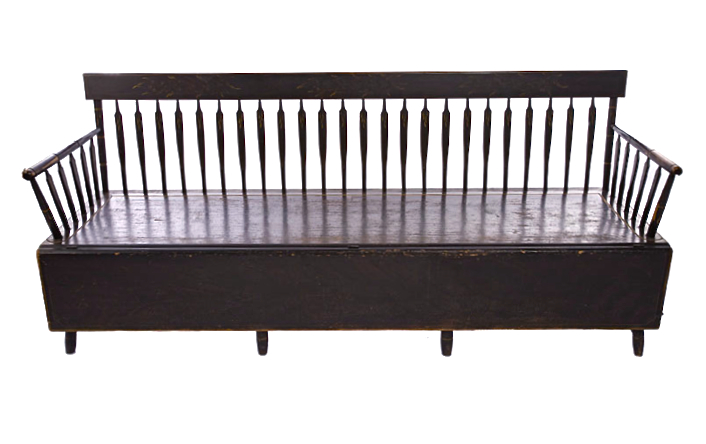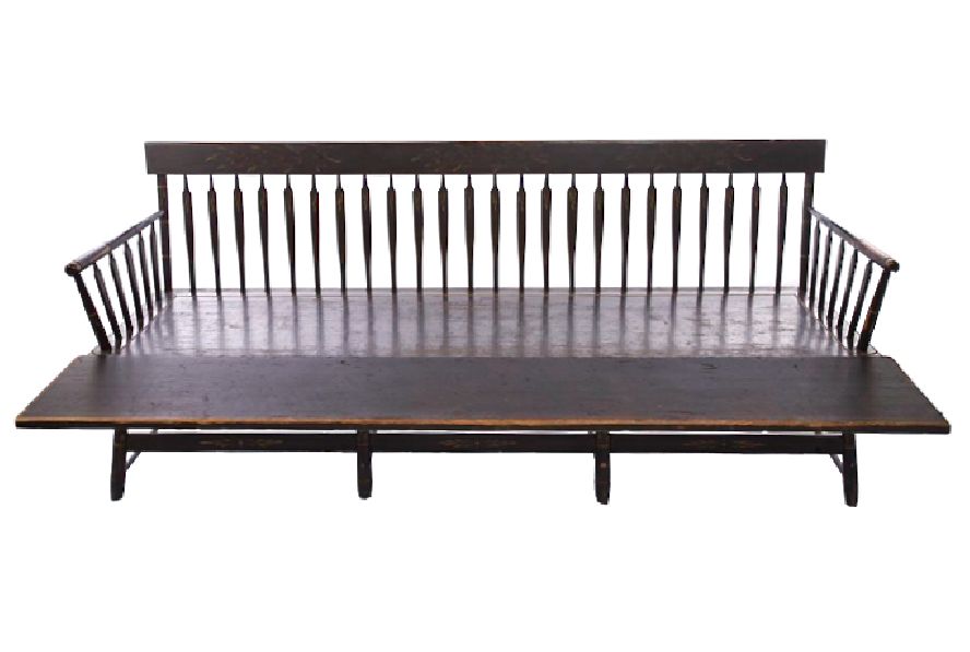 Unusual grain painted Windsor bench, finely grain painted overall with arrowback spindles, (faux) bamboo legs, singleāboard poplar plank set, grape and grape leaf decoration with painted chrome yellow highlights, early paint over original pale green (?), drop front folds up to horizontal as bed or vertical as crib, Pennsylvania, 19th century, opens to 34 in. Generally excellent condition with normal abrasions, wear to paint, drop front drilled for two removable legs (lacking), one rear leg and two stretcher elements replaced.