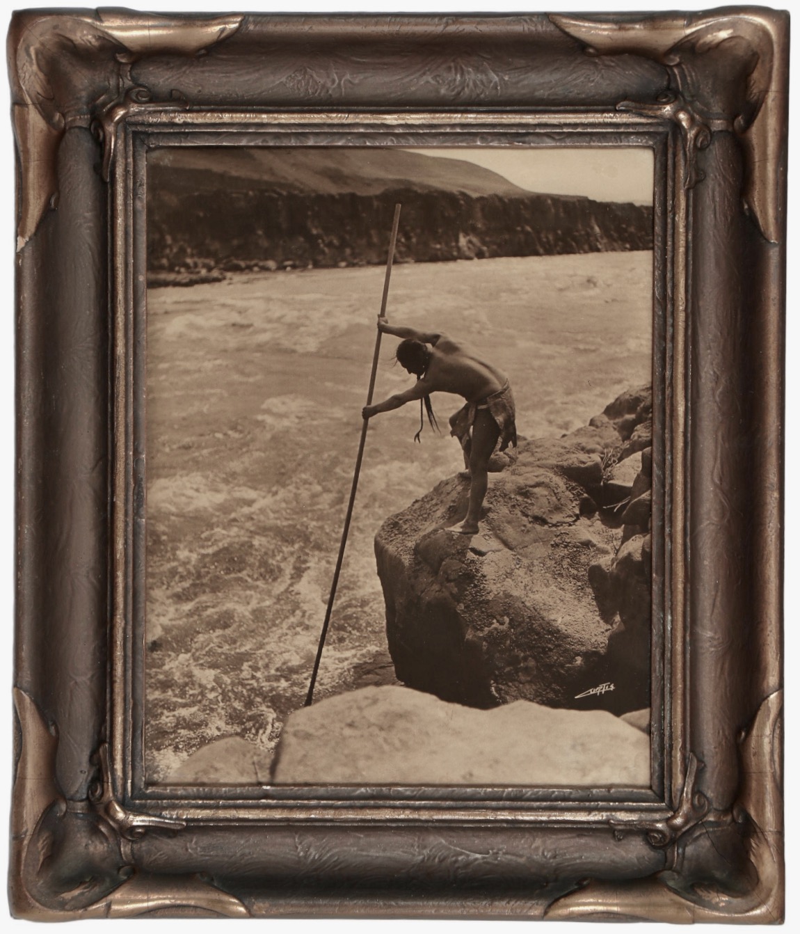 Photographed in 1909 The Wasco-Wishram are two closely related Chinook Indian tribes from the Columbia River in Oregon. Edward S. Curtis (1868-1952) This antique photograph, titled "The Fisherman, Wishham," was taken by Edward S. Curtis around 1909. It features a Native American fishing off a rock. Chinook People Spearing Salmon in the Columbia River A black and white photograph by Edward Sheriff Curtis, undated, depicting the Chinook people spearing salmon in the Columbia River.