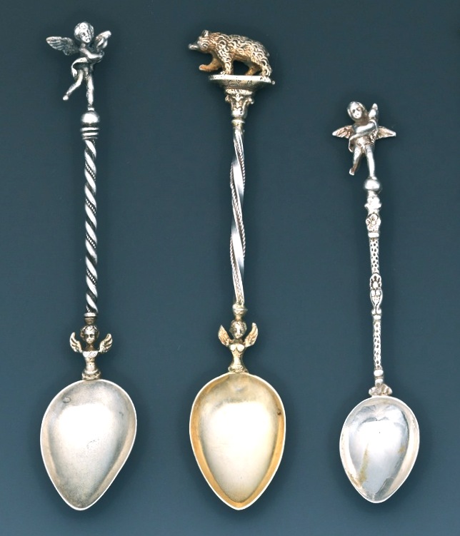 Three very old silver spoons: A 4"L demi-spoon with relief design on the stem and a putto at the end. Next a 4-3/4"L spoon with worn gold wash, angel at the base of the twisted stem and putto at the end, and another 4-3/4"L spoon with gold wash, angel at the base of the stem, bear at the end. Each piece marked 800. Total weight 1.91 toz. Condition: Light wear from polishing. Gold wash worn. *All of the art is edited and chosen by us for its high quality and workmanship before posting. These collectibles have been selected with the artist & collector in mind. We are committed to enhancing our customer’s lives by discovering creating, and pointing out only the best art we can find in the world today. We Are Taste-Makers, Art Advisers, Consultants & Publishers Of Spectacular Art Stories. Our job is to be intermediaries between buyers and sellers. We are vetting for high end art patrons. We are determined to catalog the world's most exceptional art and share it with everyone.