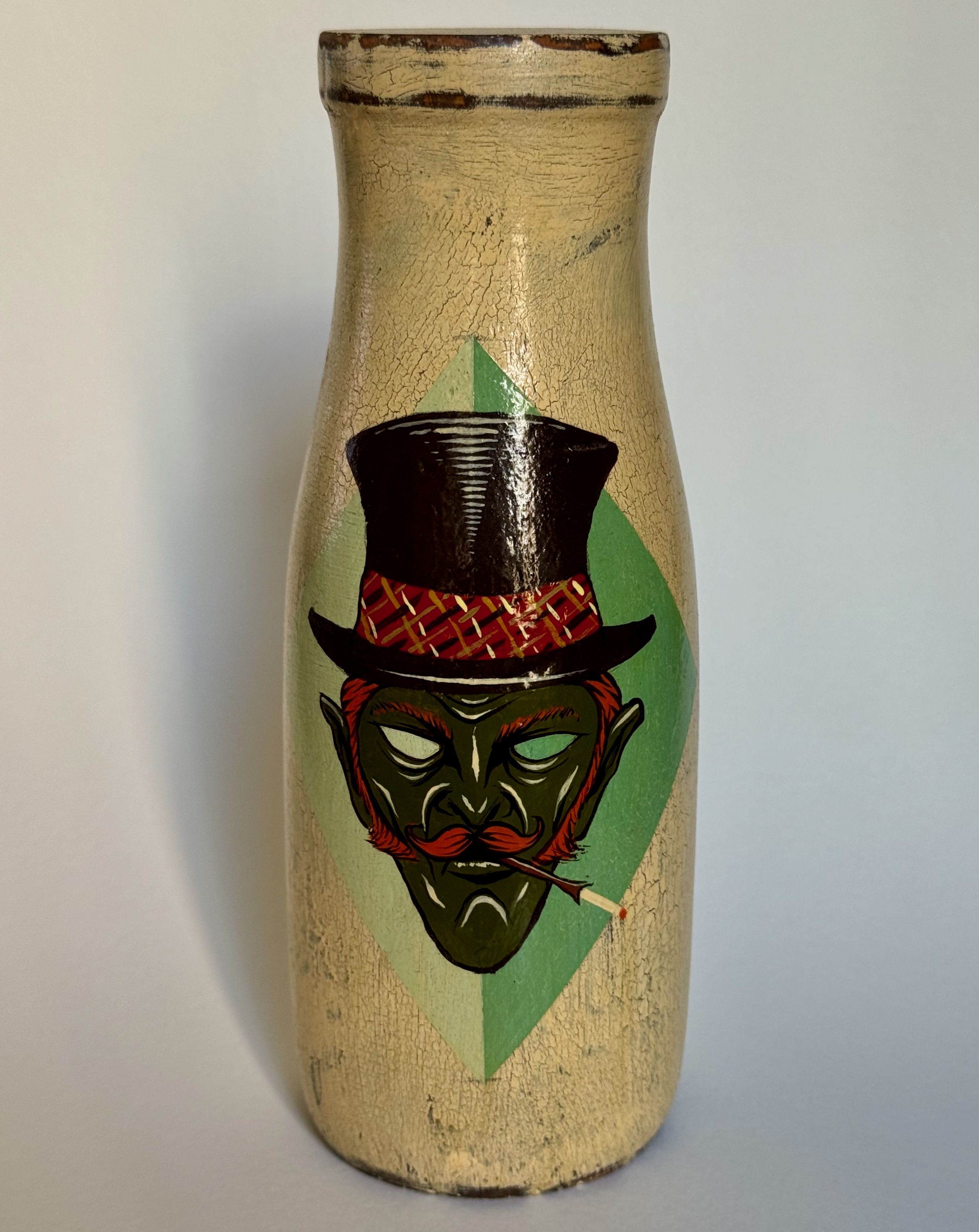 Carnival Graffiti Art Milk Bottle: Faustian Bargain Game" by folk artist Mike Shine Original art by graffiti artist Mike Shine: "Flotsam’s Wonder World" is an 8 1/2-inch-tall, hand-painted stencil graffiti piece on a three-dimensional yellow wooden milk bottle. The contemporary folk art painting features a carnival character head portrait with a green face, red hair, a cigarette, a top hat, and devilish features. The bottle is hand-signed in pencil and has a logo at the bottom of the bottle. Shine's work is inspired by carnivals and includes large-scale stencil murals. His art is created for people to enjoy on multiple levels—both superficially and in depth. He criticizes much of modern art for requiring specific contexts for interpretation, aiming instead for his own work to be universally understandable, transcending cultural and language barriers. Blending influences from lost carnivals, Nordic mythology, and hazy nostalgia, Mike Shine's eerie yet often light-hearted art has been featured in exhibitions with SFMOMA, Laguna Art Museum, and The Museum of Craft and Folk Art. His installations have been commissioned and collected worldwide. His mixed media pieces typically involve house paint on found objects like driftwood, buoys, carnival bottles, and ephemera. The art "opera" centers on a carnival ringleader named Flotsam, whom Shine considers his personal version of Mephistopheles. Shine’s projects encompass large-scale street murals, extensive installations, and performances, all unified by his mythical character creation, Dr. Pyotr Mastolf Ilyas (also known as Dr. Flotsam). Mastolf Ilyas represents Shine’s modern-day interpretation of Mephistopheles, portrayed as a centuries-old Eastern European carnival leader. The Mike Shine Show was a mix of Fastelavn carnival, a Threepenny Opera, and an interactive installation. Featuring carnival games and eerie clowns, Shine’s latest experience successfully brought back the fun and wonder of art to both parents and children—an impressive feat in the often stuffy atmosphere of museum settings. Shine draws inspiration from the philosophies of Johann Wolfgang von Goethe and Friedrich Nietzsche, as well as the operas of Richard Wagner. His diverse body of work is unified through his mythical character, Dr. Flotsam, which he developed by blending these influences. For millennia, Dr. Flotsam has been performing his carnivals, tricks in the woods, and other acts with his traveling medicine show. Essentially, he’s been collecting souls—a twisted take on the Faustian bargain.