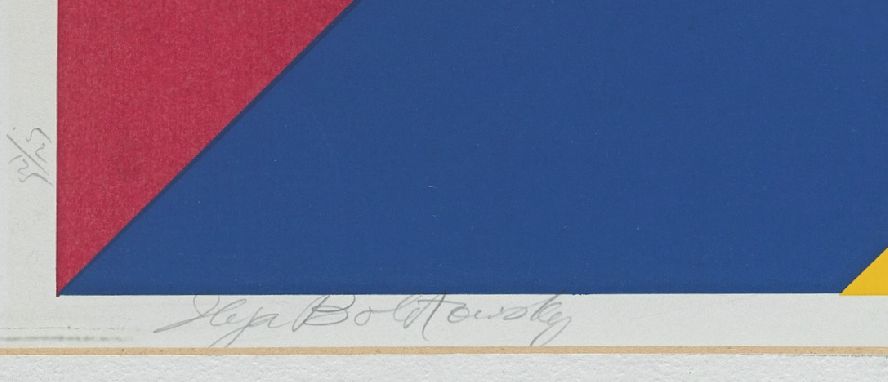 This is a true silkscreen abstract masterpiece by one of the great Neoplasticism abstract artists. Ilya Bolotowsky (Russian/American, 1907-1981) "Diamond". Screenprint in colors, ca. 1970, signed in corner and numbered 52/125 in pencil, matted and framed overall 27 x 27 in. Very Rare Print Silkscreen on Hi-White paper, Signed in pencil and marked by the artist. Ilya Bolotowsky was born in Petrograd, Russia in 1907. He died in the USA in 1981. Bolotowsky emigrated to the United States in 1923 and became an American citizen in 1929. He studied at National Academy for Design in New York 1924-30, and won drawing prizes, painting prizes, Louis Comfort Tiffany Foundation Scholarship, and the Yaddo Foundation Fellowship. Bolotowsky was influenced by Mondrians in the Gallatin Collection, and Miros at Pierre Matisse Gallery, which led to his first abstract work in 1933. Bolotowsky was a member of The Ten with Rothko, Gottlieb, and others in the mid-1930's. He was an active member of the WPA Federal Arts Project and was co-founder and charter member of the American Abstract Artists. Bolotowsky taught at Brooklyn College, Hunter College, University of Wisconsin, University of New Mexico, and Columbia University. He won the Abstract Painting Prize from the National Institute of Arts and Letters, and grants from the Museum of Non-objective Painting in New York. He is well known for his public murals including the ones at: the Hall of Medical Science at the 1936 World's Fair; Chronic Diseases Hospital in New York; two for the Phillips Steel Company in Pittsburgh; Cinema I and the Passenger Ship Terminal in New York. Bolotowsky's work is collected by major world corporations including: New York's Chase Manhattan Bank and Ciba-Geigy. The list of galleries and museums which have exhibited his work is extensive. Bolotowsky is collected in major museums including: New York's Whitney Museum of American Art; Museum of Modern Art, New York; Guggenheim Museum, New York; Washington's Joseph H. Hirshorn Collection, and the National Collection of Fine Arts at the Smithsonian Institution. Condition: Not inspected out of frame. Frame with wear. Visible surface discolorations. * * All of the art is edited and chosen by us for its high quality and workmanship before posting. These collectibles have been selected with the artist & collector in mind. We are committed to enhancing our customer’s lives by discovering creating, and pointing out only the best art we can find in the world today. We Are Taste-Makers, Art Advisers, Consultants & Publishers Of Spectacular Art Stories. Our job is to be intermediaries between buyers and sellers. We are vetting for high end art patrons. We are determined to catalog the world's most exceptional art and share it with everyone.
