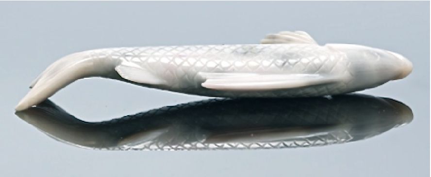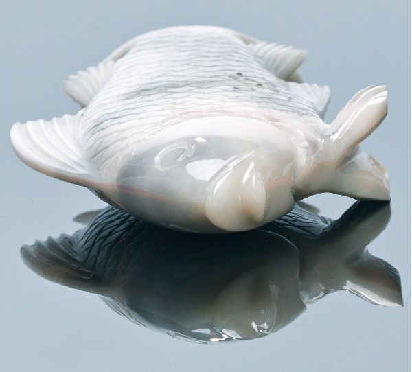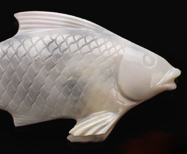 Title: Hand Carved Hard Pinkish-White Stone Jade Asian Carp Fish