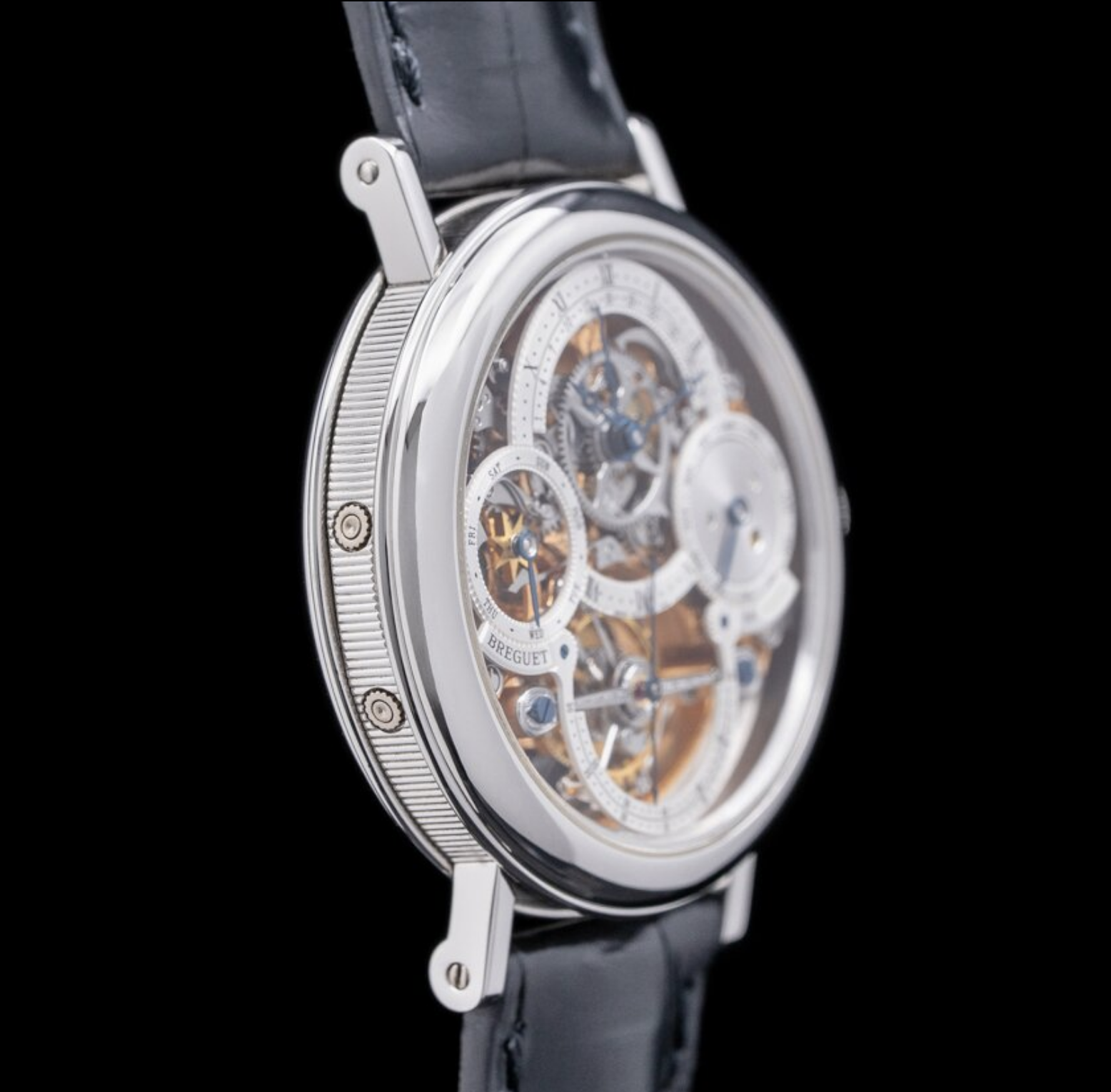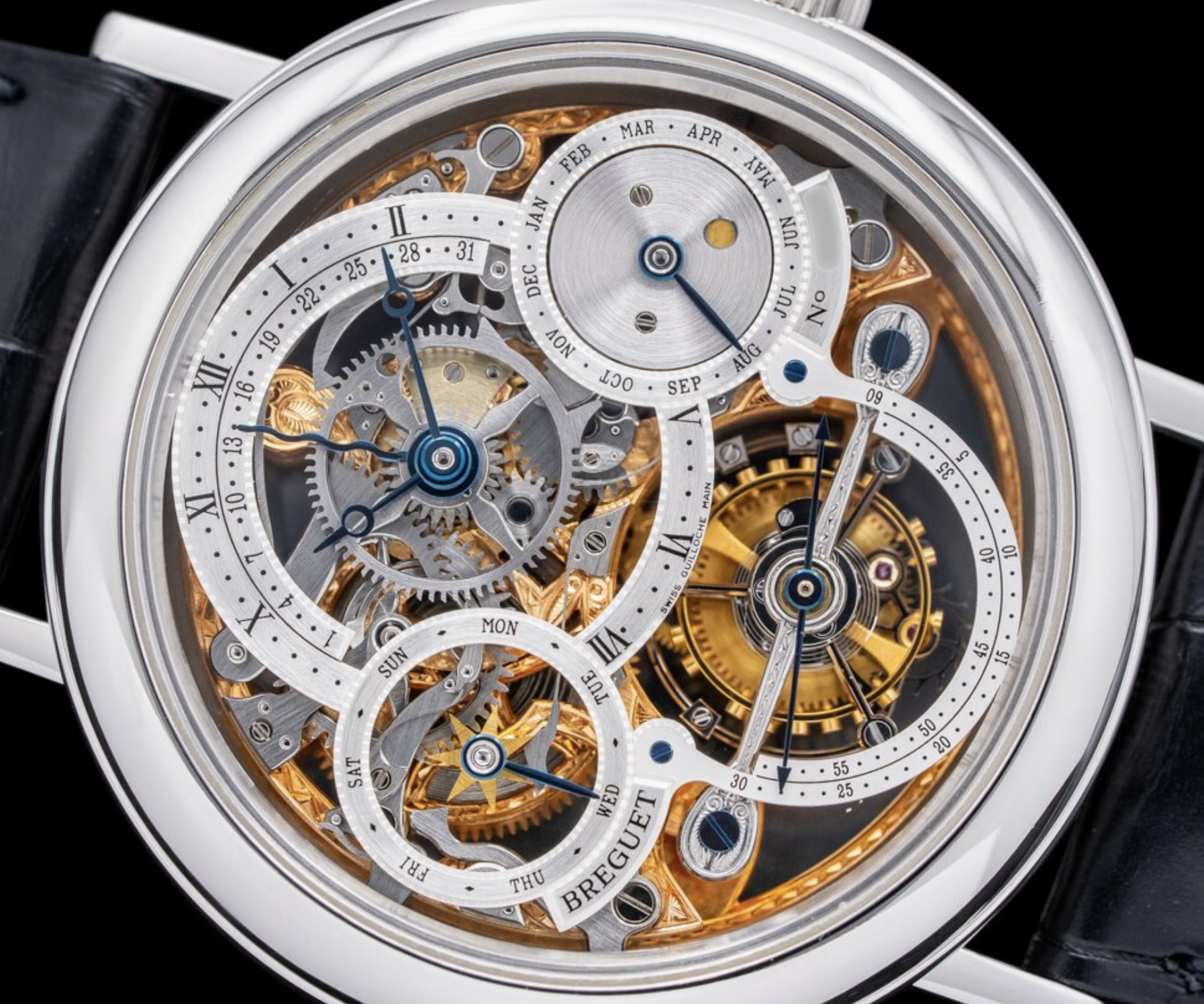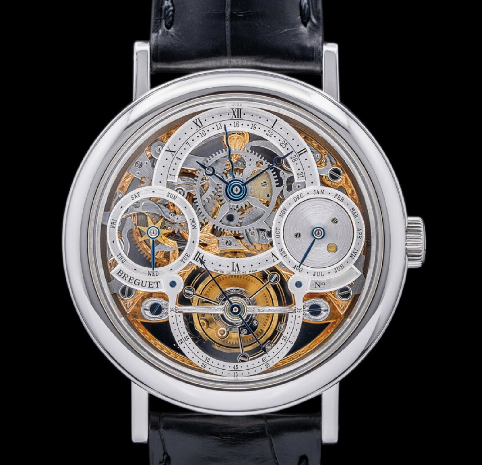The Breguet Tourbillon Perpetual Calendar Skeleton Platinum Manual is a timepiece that exemplifies the fusion of horological complexity, historical significance, and exquisite craftsmanship. To understand this watch, we need to explore several key aspects: the Breguet brand's legacy, the development of the tourbillon, the perpetual calendar, and the skeletonization technique. Breguet's Legacy Founded in 1775 by Abraham-Louis Breguet, the Breguet brand is synonymous with innovation and precision in watchmaking. Breguet is credited with several major advancements, including the invention of the tourbillon, which he patented in 1801. The brand has been favored by royalty and notable figures throughout history, making it one of the most prestigious watchmakers in the world. The Tourbillon The tourbillon is one of Breguet's most famous inventions, designed to counteract the effects of gravity on the accuracy of pocket watches. By placing the escapement and balance wheel in a rotating cage, the tourbillon averages out positional errors, resulting in improved timekeeping precision. The tourbillon has since become a symbol of high watchmaking, often featured in luxury timepieces as a demonstration of technical prowess. Perpetual Calendar A perpetual calendar is a highly sophisticated complication that automatically adjusts for the varying lengths of months and leap years, ensuring that the watch displays the correct date, month, and year without the need for manual adjustment. This feature is particularly challenging to implement, as it requires intricate gear systems and precise engineering. Skeletonization Skeletonization refers to the process of removing as much material as possible from the watch movement and dial to expose the inner workings of the timepiece. This technique not only showcases the craftsmanship and complexity of the movement but also requires exceptional skill to ensure the watch remains structurally sound and functional. The Breguet Tourbillon Perpetual Calendar Skeleton This particular model is a masterpiece of horology, combining the tourbillon, perpetual calendar, and skeletonization in a single timepiece. The watch is crafted in platinum, which adds to its rarity and luxury. Platinum is a dense and durable metal, making it ideal for high-end watches, though it is notoriously difficult to work with, further emphasizing the craftsmanship involved. The manual winding mechanism adds a traditional touch, requiring the wearer to interact with the watch regularly, a nod to the age-old practices of watchmaking. The skeletonized design allows the wearer to admire the complexity of the movement, including the rotating tourbillon cage and the intricate perpetual calendar gears. In essence, the Breguet Tourbillon Perpetual Calendar Skeleton Platinum Manual is a celebration of Breguet's historical contributions to watchmaking and a testament to the brand's continued commitment to pushing the boundaries of horological innovation. It is not just a timepiece but a work of art that encapsulates centuries of watchmaking tradition and expertise.