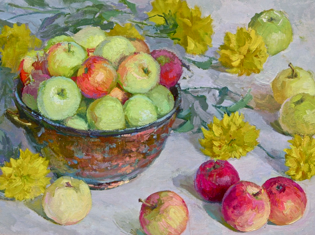 Title: Oil Painting On Canvas Still Life with Apples and Yellow Flowers