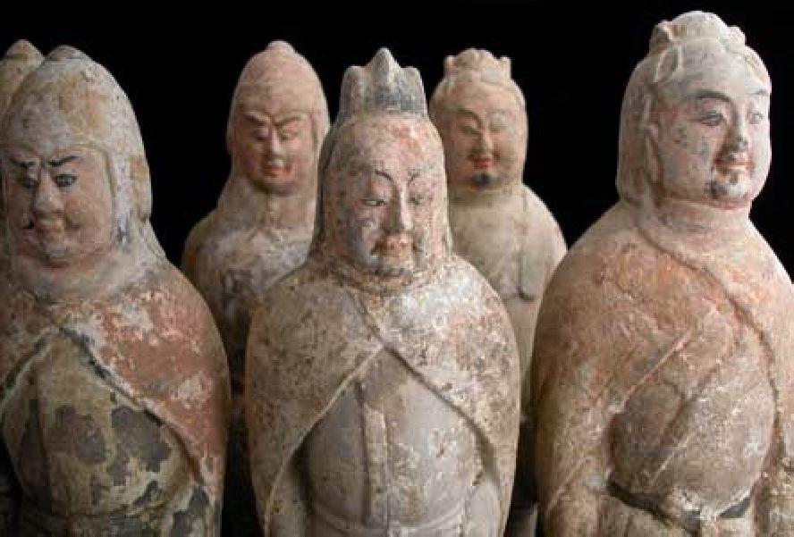 Origin: China Circa: 550 AD to 577 AD Dimensions: 12.75" (32.4cm) high Collection: Chinese Medium: Painted Terracotta An amazing archaeological find, a set of terracotta warriors. Qí) was one of the Northern dynasties of Chinese history and ruled northern China from 550 to 577. As implied by its short duration, the Northern Qi Dynasty was a turbulent time in the vast history of China. Locusts plagued the lands, ruining the crops. Hunger and ethnic feuding ravaged the population. This set of ten warriors is a memorial to the only individual that could secure peace and prosperity in such chaotic times. Clearly, none of the turmoil is exhibited in these calm, refined representations of warrior figures. They stand tall, some wearing armor, others dressed in a sleeveless tabard draped over a long-sleeved garment secured at their waist with a band. They wear small, snug caps while those in armor brandish pointed helmets, both typical of this era. Some of the original polychrome paint that once decorated these works is still visibly, most often seen on their faces, shoes, caps, or belts. Originally, these warriors would have brandished weapons inserted into the holes present in their hands. Most likely halberds or spears, these weapons were probably fabricated in a material such as wood that deteriorated over the centuries. This group was discovered entombed together in the grave of an elite member of the Northern Qi nobility. Although they were intended to protect the tomb and ward off any infiltrators, be they robbers or malevolent spirits, these warriors do not repel us; instead, their compelling history and stunning aesthetic beauty attracts us to them.
