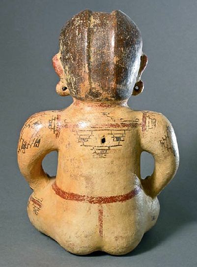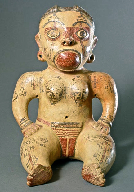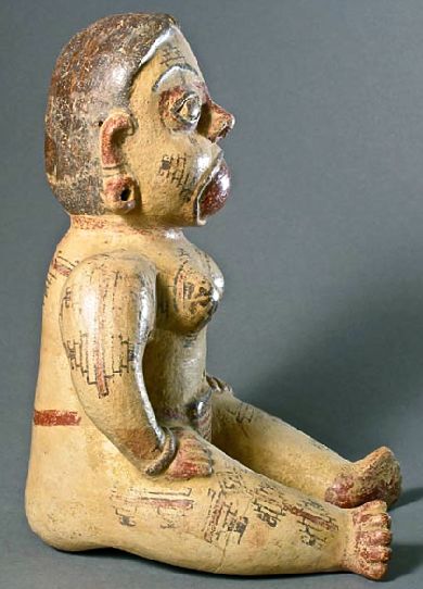 Galo Polychrome Seated Female Figure. Origin: Costa Rica (Guanacaste) Circa: 500 AD to 800 AD Dimensions: 11.5" (29.2cm) high Collection: Pre-Columbian Medium: Terracotta "Looking back so many thousands of years, it seems as if humanity's first image of life was the mother. This must go back to a time when human beings experienced themselves as the children of nature, in relationship with all things, part of the whole." (Baring and Cashford, The Myth of the Goddess) Baring and Cashford are referring to the oldest sculpture of a Goddess, from about 22,000 B.C. from Brassempouy in the Landes area of France. They also state, "It is not surprising that these images of the Goddess appear throughout history, for they all express a similar vision of life on earth, one where the creative source of life is conceived in the image of a mother and where humanity feels itself and the rest of creation to be the mother's children." This beautiful female who sits before us may be a representation of a 'Mother Goddess,' as well. The lines etched around the outside of her breasts and the designs surrounding them direct attention to the sacred source. The center focus is directed to the nourishment of the flowing breast. The central theme of nourishment is all- inclusive. The shape of her full breasts and the swelling curves of her hips with the hole for the belly button, all emphasize the feeling of fecundity. A distinct division of her legs open at the entrance to the womb. The rippling movement of water painted above her womb suggests the source of the vegetative world and also of the waters of life. The geometric designs covering her voluptuous body may symbolize the sacred way of approach to a dimension invisible to human senses. "All these form an enduring constellation of images related to the figure of the Goddess, for they symbolize the intricate pathway that connects the visible world to the invisible, of the kind that souls of the dead would have taken to re-enter the womb of the Mother." (Baring and Cashford) The mouth is a peculiar part of this remarkable figure. Could this be an egg? The egg is also related to water as the primordial element in which life gestates. The egg and the womb are both images of the beginning of life. If she represents the mythical image from which creation emerged, she is surely one of the most beautiful goddesses in the enchanted world of fertility and birth. We are committed to enhancing our customer’s lives by discovering creating, and pointing out only the best art we can find in the world today. We Are Taste-Makers, Art Advisers, Consultants & Publishers Of Spectacular Art Stories. Our job is to be intermediaries between buyers and sellers. We are vetting for high end art patrons. We are determined to catalog the world's most exceptional art and share it with everyone.