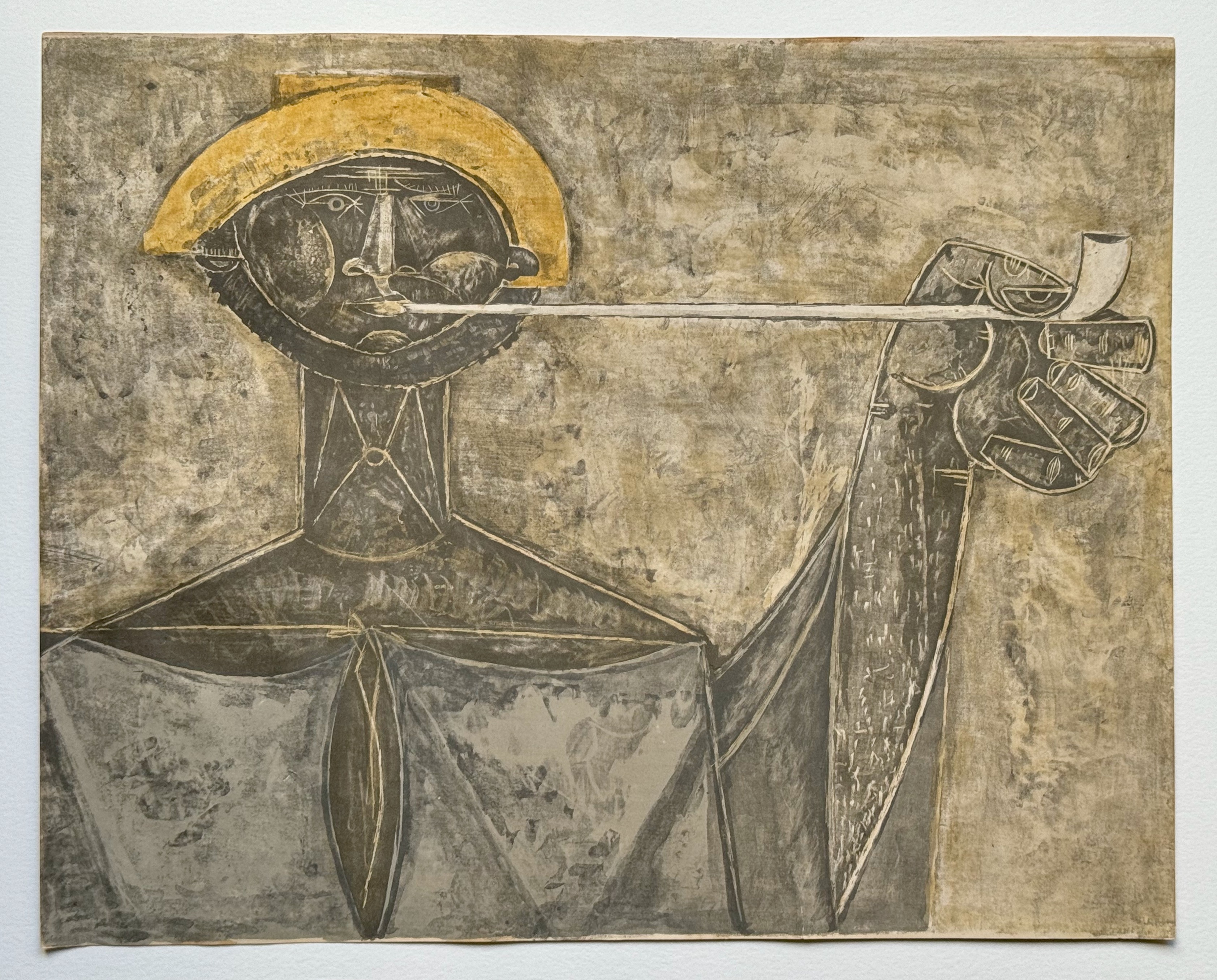 This post-war figure with a clay pipe is a work on paper that appears to be an original gouache painting, although the artist is unknown. The style is reminiscent of Picasso’s cubist approach. It could potentially be a serigraph or a monoprint, but the exact medium is difficult to determine. If this were an original Picasso painting, it could be valued in the tens of thousands, though no verification is currently possible as it is unsigned. The piece features a Picasso/cubist-style figure holding a long clay pipe, presented as a serigraph. The artwork is unsigned, measuring 14.5" x 18" and unframed. The abstract work is unsigned. The piece is unframed. Much like watercolor, gouache is a pigment that needs to be mixed with water to spread across paper or other surfaces. Gouache, also known as body color or opaque watercolor, is a water-based paint made from natural pigment, water, a binding agent, and sometimes inert materials. Unlike watercolor, gouache is designed to be opaque, with a matte finish, sitting between watercolor and acrylic paint in terms of texture and opacity. Gouache has been used for at least twelve centuries, making it a long-established medium. Even years after its initial application, gouache can be reactivated with water and worked on again. While gouache as a technique has existed for thousands of years, the term itself originated in 18th-century France, derived from the Italian painting technique “guazzo,” which produces a similar matte effect. This beautiful and very collectible work on paper is estimated and valued at over $800, and we will verify its availability upon your price inquiry. At BusaccaGallery.com, we vet all customers for transactions over $5,000 to ensure a secure and satisfactory experience for both parties. Please read the innovative story and watch the informative video we provide for each piece of these highly collectible works of art. If interested please contact us.