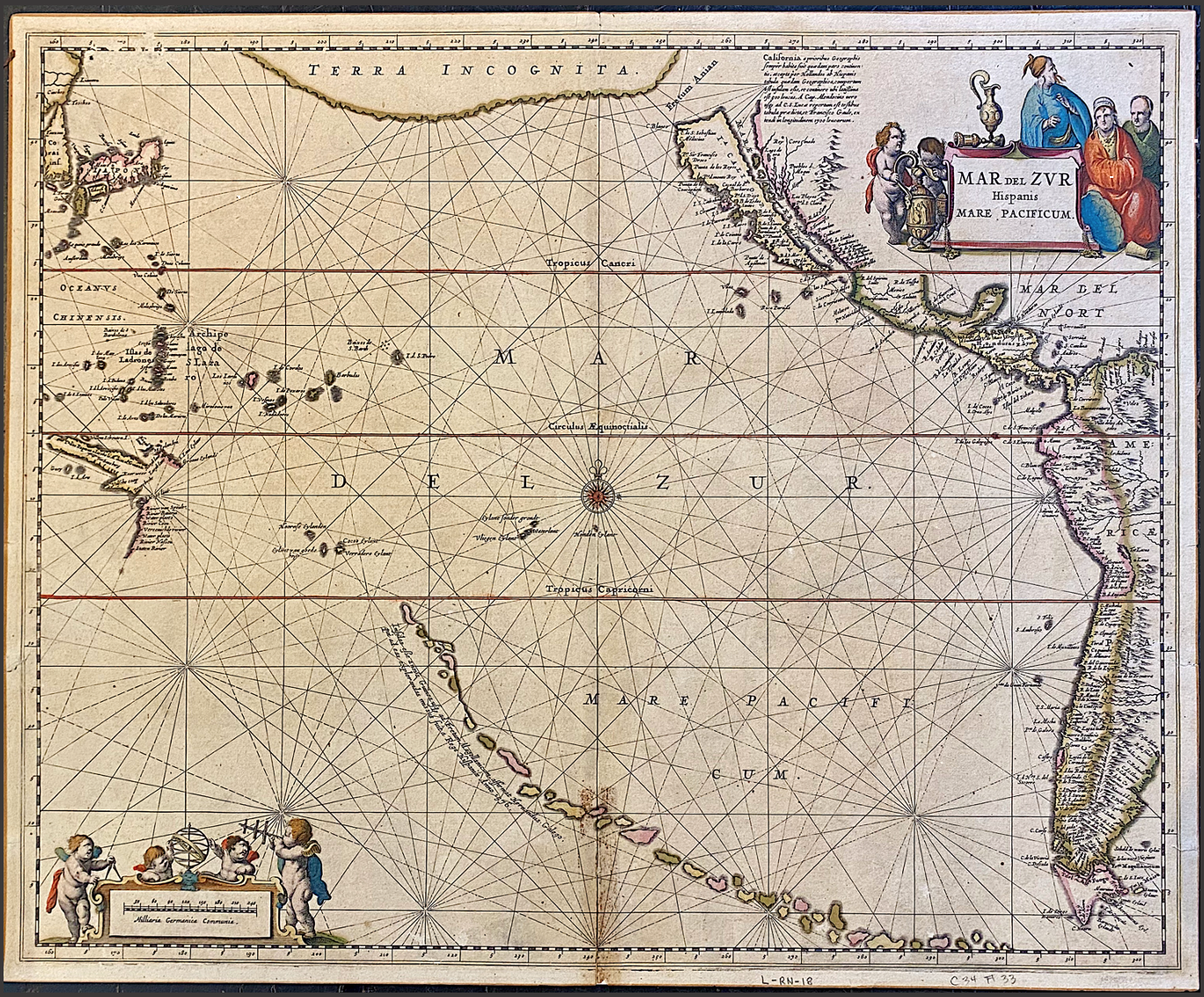 A Rare antique 17th century map by Jansson, Jan, 1588-1664. A Map Collection of California as an Island. Rare antique 17th century map by Jansson, Jan, 1588-1664 - titled Mar del zvr Hispanis Mare Pacificum: Issued in: Grand Atlas, (French edition)/ Johannes Jansson. -- Amsterdam, 1650. Reissued 1652, 1657, 1668, and later.Issued in: Atlantis majoris qvinta pars, orbem maritium sev omnium marium totius orbis terrarium navigationibus... [Map] 99 / Ioannem Ianssonium, 1657. Map of the Pacific with California as an island of Briggs type, with nearly flat northern coast, and with many place names. Mare Vermio to its east. A large area called Terra Incognita is separated from California by Fretum Anian. Island chain with descriptive text runs northwest from tip of South America to Tropicus Capricorni. Text concerning California appear near title cartouche (upper right), which is surrounded by Asian figures and cherubs. Cartouche (lower left) gives scale in "Millaria Germanica Communia" and is surrounded by cherubs with surveying instruments. Our job is to find and target great art by collecting a vast array of contemporary, vintage, antique and collectible items from across the globe. Individually handcrafted, we breathe new life into these forgotten relics by giving back each piece it's unique story. *All of the art is edited and chosen by us for its high quality and workmanship before posting. These collectibles have been selected with the artist & collector in mind. We are committed to enhancing our customer’s lives by discovering creating, and pointing out only the best art we can find in the world today. We Are Taste-Makers, Art Advisers, Consultants & Publishers Of Spectacular Art Stories. Our job is to be intermediaries between buyers and sellers. We are vetting for high end art patrons. We are determined to catalog the world's most exceptional art and share it with everyone.