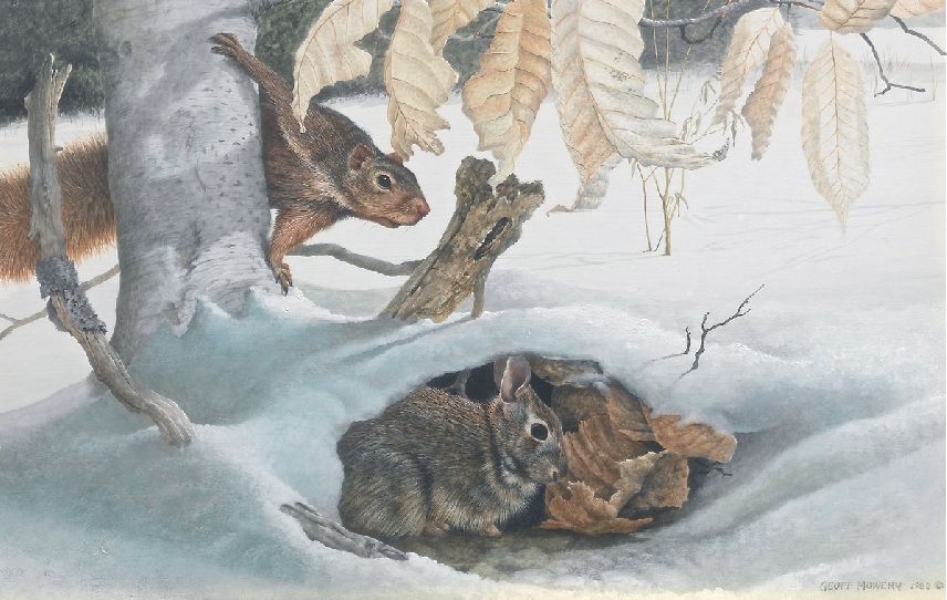 Artist Geoff Mowery (American, b. 1945) Squirrel and Rabbit. Egg tempera on tempered masonite panel, signed and dated 1983 in the lower right corner, matted and framed under glass overall 21" x 27-7/8". Panel size 13" x 20". Condition: Good. Geoff's earliest work was always wintery. He did virtually all his observations of animals in their natural habitat, and they were easiest seen against the white of the snowy landscape. - Our job is to find and target great art by collecting a vast array of contemporary, vintage, antique and collectible items from across the globe. Individually handcrafted, we breathe new life into these forgotten relics by giving back each piece it's unique story. *All of the art is edited and chosen by us for its high quality and workmanship before posting. These collectibles have been selected with the artist & collector in mind. We are committed to enhancing our customer’s lives by discovering creating, and pointing out only the best art we can find in the world today. We Are Taste-Makers, Art Advisers, Consultants & Publishers Of Spectacular Art Stories. Our job is to be intermediaries between buyers and sellers. We are vetting for high end art patrons. We are determined to catalog the world's most exceptional art and share it with everyone.