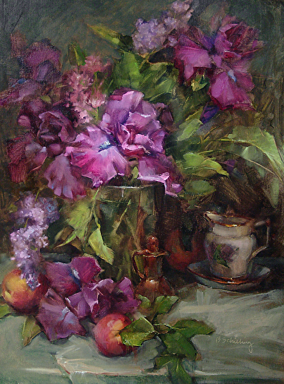 Title: Irises-and-Nectarines Still Life Painting By Artist Barbara Schilling