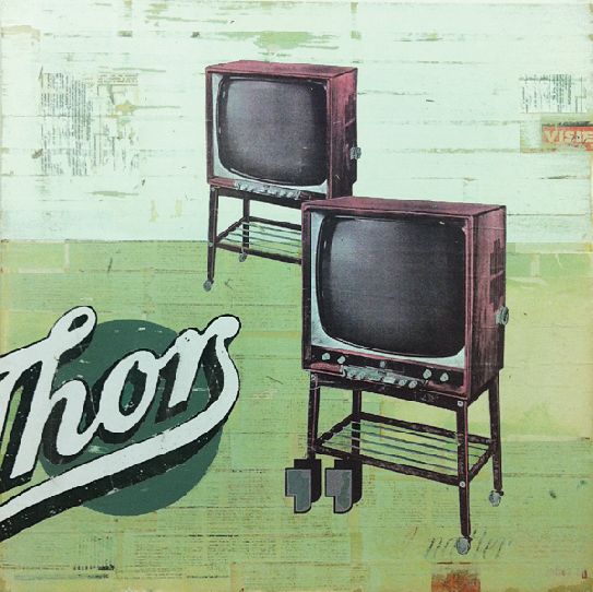 "Two Televisions" by Kareem Rizk is an original mixed media artwork featuring collage and acrylic on a cradled wood panel. It is just one example of Rizk's distinctive nostalgic and ephemeral collage style. The weathered and tactile surfaces, often portraying a vintage aesthetic, are carefully layered with a consistent emphasis on design and dynamic composition, reminiscent of Minimalism. This strong focus on design and layout can be traced back to the artist's background in Graphic Design. Refined color combinations, typography, solid shapes, and nostalgic imagery are key elements in constructing Rizk's collages. Interestingly, there is often no preconceived concept or message, allowing the viewer the opportunity to create their own story or narrative when observing the work.