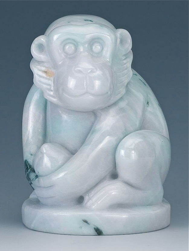 Title: White & Green Carved Jadeite Seated Monkey Figure Holding Peach