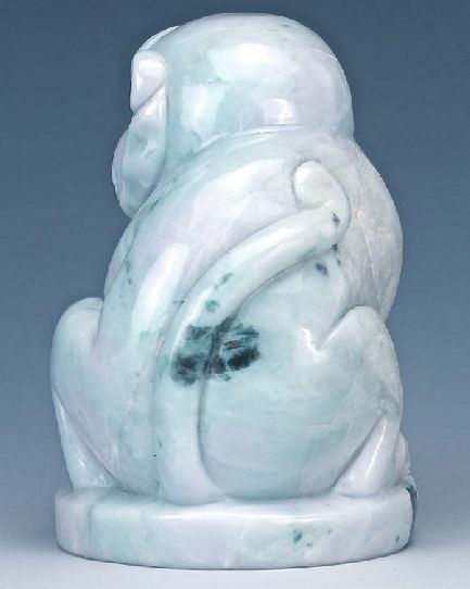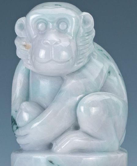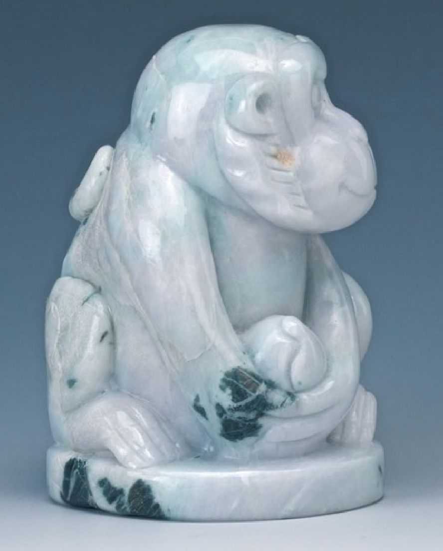 Adorable jadeite carving of a smiling monkey holding a peach with great detail. Carved and highly polished Ice White and green jadeite figure of a seated monkey holding a peach, on a carved wood stand Condition: Good. Natural inclusions. 4½" with stand. Jadeite is formed in metamorphic rocks under high pressure and relatively low temperature conditions. * We specialize in high end luxury fine art and collectibles from private estates. - Our job is to find and target great art by collecting a vast array of contemporary, vintage, antique and collectible items from across the globe. Individually handcrafted, we breathe new life into these forgotten relics by giving back each piece it's unique story. We welcome dealers, galleries, and private collectors to register securely and buy with us.