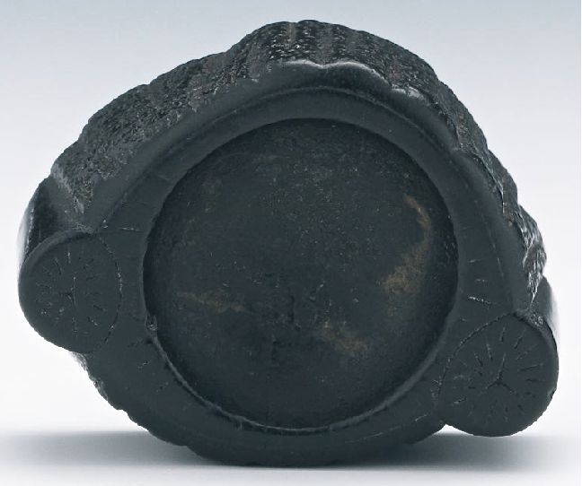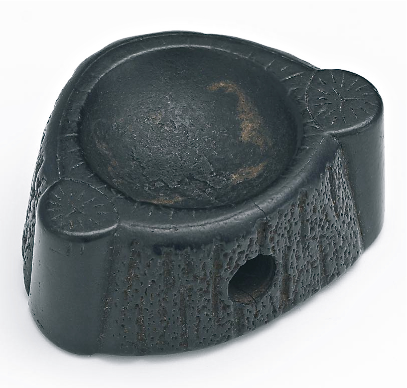 Their solution was to place such objects in containers (called sagemono) hung by cords from the robes' sashes (obi). The containers may have been pouches or small woven baskets, but the most popular were beautifully crafted boxes (inrō), which were held shut by ojime, which were sliding beads on cords. Whatever the form of the container, the fastener that secured the cord at the top of the sash was a carved, button-like toggle called a netsuke.