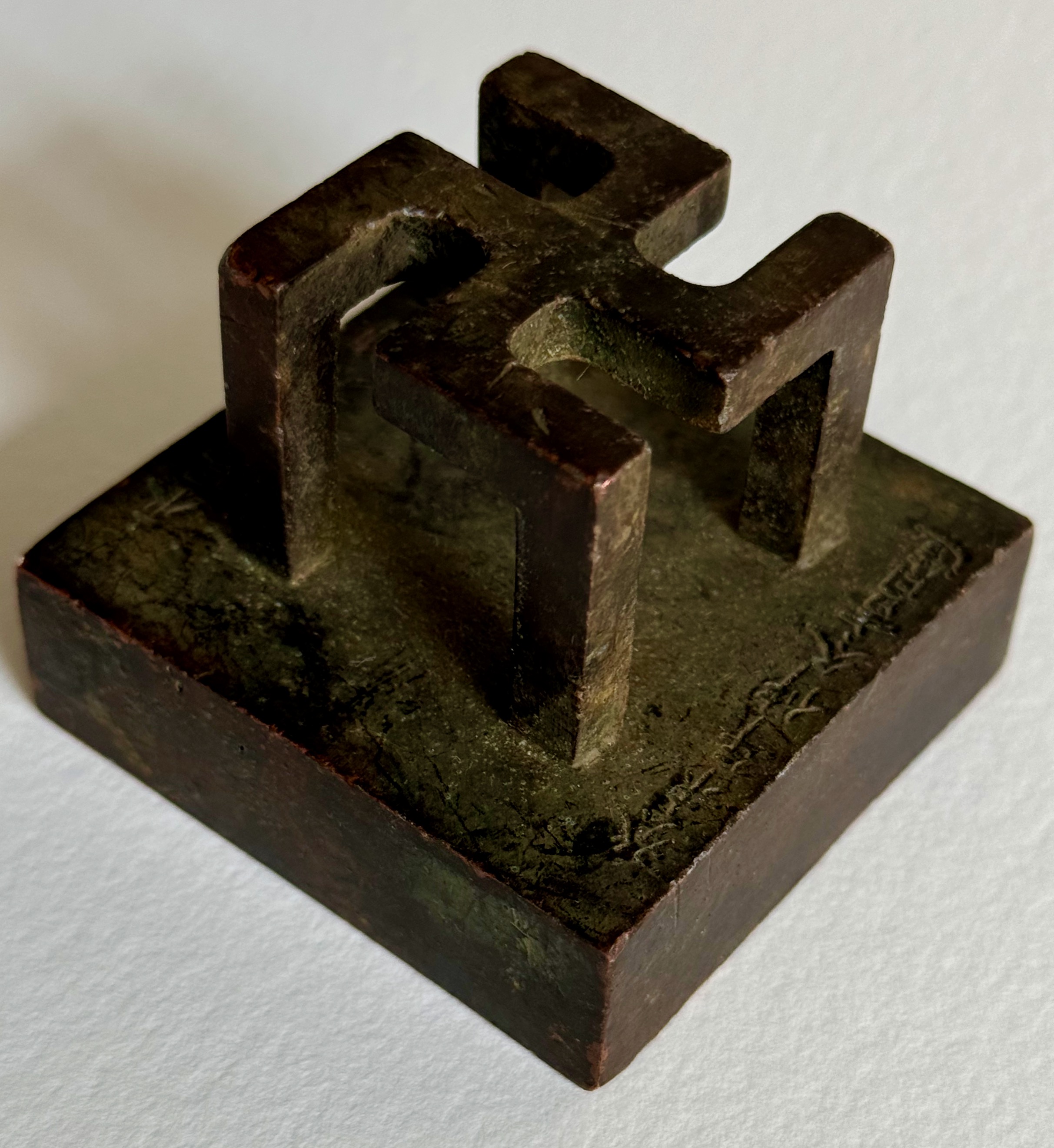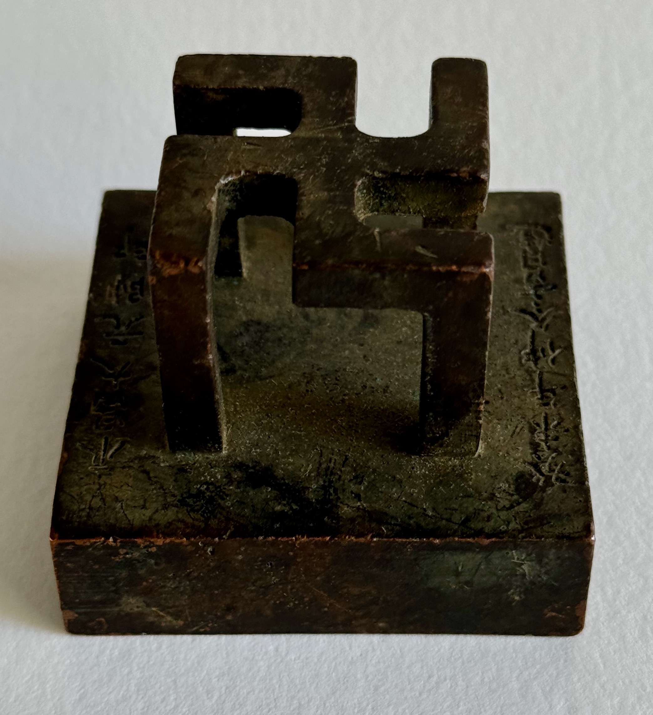 This is a spectacular Large Antique Chinese Signature bronze Stamp Seal Chop Tool Swastika. These seals were used by emperors, government officials, and private individuals to authenticate documents, deeds, and other official papers. The swastika's introduction to China is largely associated with the arrival of Buddhism from India around the 1st century CE. In Buddhism, the swastika symbolizes the footprint of the Buddha and represents eternity, the cycle of life, and the infinite nature of Buddha's teachings. It can be found in Buddhist art, scriptures, and temples across China. The symbol itself predates Buddhism, having roots in ancient Indian cultures where it represented good fortune and auspiciousness. When Buddhism spread to China, the swastika was adopted and became an integral part of Chinese Buddhist iconography. The symbol is often depicted on statues of the Buddha, especially on his chest or palms, symbolizing his eternal power and the universal nature of his teachings. In China, the swastika can appear in two forms: clockwise (卍) and counterclockwise (卐). While the clockwise version is the more commonly seen form, both are considered auspicious in Chinese culture. The symbol is associated with longevity, prosperity, and harmony, embodying the concept of "ten thousand things" or the totality of existence. / Bronze seals, however, became more popular during the Zhou Dynasty (1046–256 BCE) and reached their peak in the Han Dynasty (206 BCE–220 CE). The size 2 1/4 inch square. The height is 2 inches tall. I have not been able to interpret the signature. During the Ming (1368–1644) and Qing Dynasties (1644–1912), the use of bronze seals became widespread. The styles became more sophisticated, with intricate designs and high-quality craftsmanship. Seals were often passed down through generations, becoming family heirlooms. Antique Chinese bronze seals have become valuable collector's items due to their historical and cultural significance. Collectors often look for seals that have clear and well-preserved inscriptions, intricate carvings, and a rich patina that develops over time. Many bronze seals are also valued for their aesthetic qualities, particularly those with mythological creatures or intricate designs on the handle. The chop seals were usually pressed into a red ink paste made from cinnabar and other ingredients, creating a vivid and long-lasting mark. This practice continues today, and the red seal marks can be seen on Chinese paintings, calligraphy, and documents. Official Seals: In ancient China, officials and scholars were required to use seals to approve government decrees, orders, and legal documents. These official seals symbolized authority and were often elaborately designed to denote the status of the individual or the institution. During these early dynasties, seals were considered a mark of authority, with only the emperor and high-ranking officials permitted to use certain types. Each official had their own unique seal, and the emperor's seal, known as the "Imperial Seal," was seen as a symbol of divine authority. The use of seals in China dates back to the Shang Dynasty (c. 1600–1046 BCE), where they were primarily made from jade, gold, or stone. Antique Chinese bronze signature stamp seals, often referred to as "chop seals," have a long and culturally significant history in China. They were used as personal signatures or official seals and played an essential role in Chinese identity and communication for centuries. The term "chop" originated from the Hindi word "chhapa," meaning "stamp," and was adopted during interactions between Chinese merchants and traders from the West. Antique Chinese bronze chop seals are a unique and significant part of Chinese history, culture, and art. Their use, which spans over two millennia, reflects the importance of written communication, authority, and personal identity in Chinese society. Today, they remain prized artifacts, both for their functional history and their artistic craftsmanship.