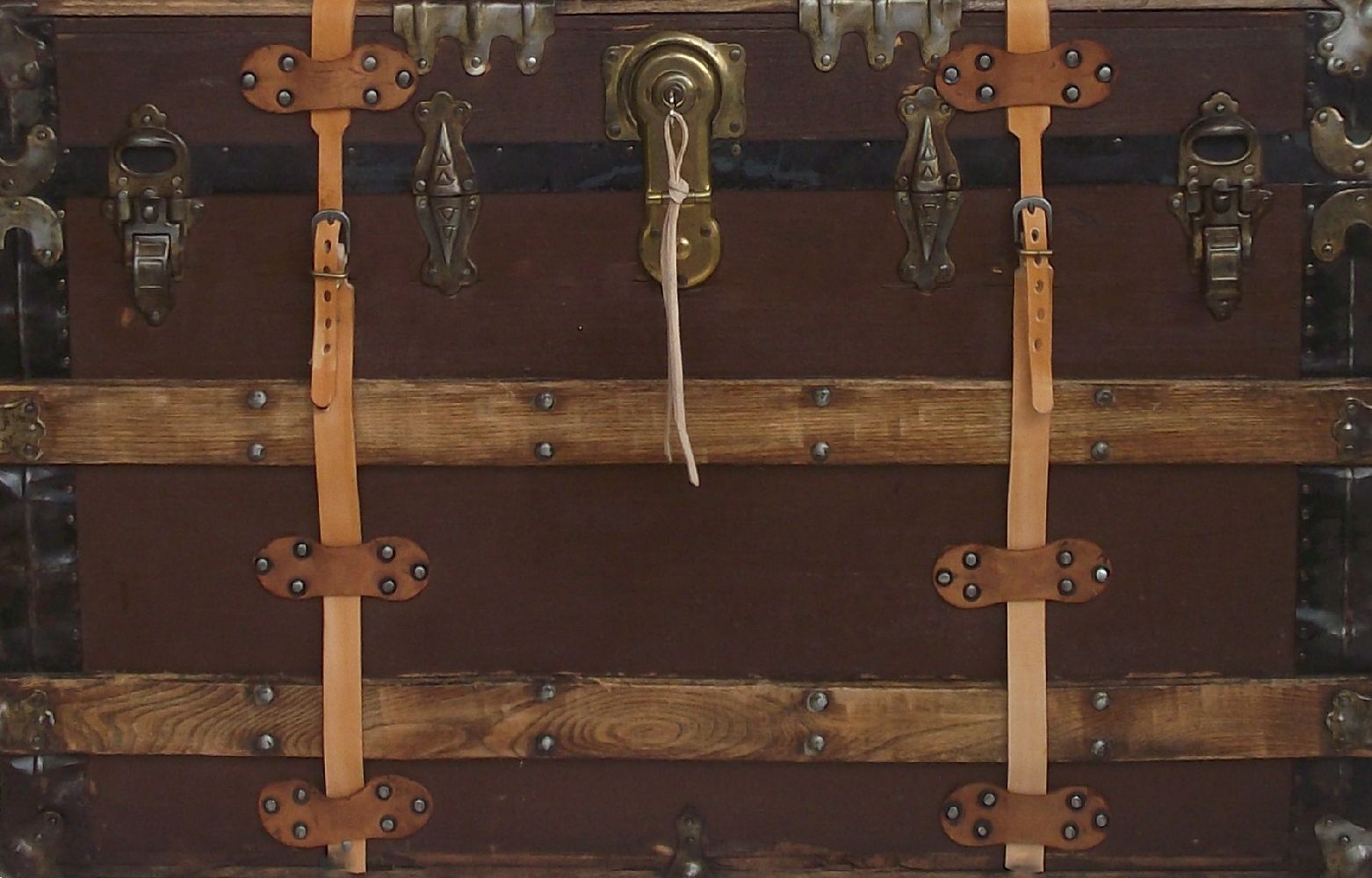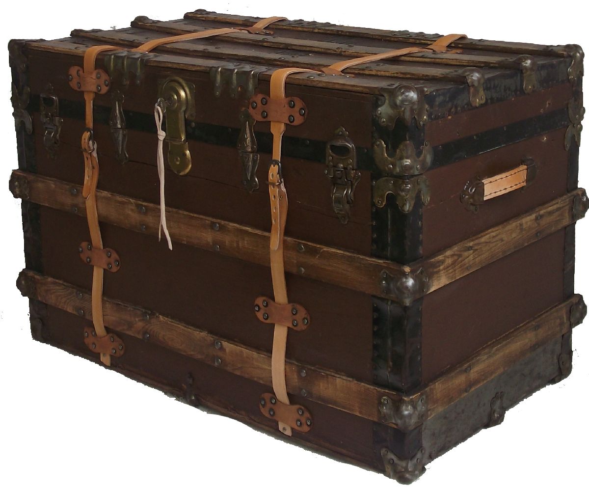 A trunk, also known as a travelling chest, is a large cuboid container for holding clothes and other personal belongings, typically about each deep and high. They were most commonly used for extended periods away from home, such as for boarding school, or long trips abroad. Most trunks are now used as either furniture such as glass-covered coffee-tables or decorative storage for everything from blankets and linens to memorabilia and military paraphernalia. Trunks are differentiated from chests by their more rugged construction due to their intended use as luggage, instead of the latter's pure storage. Among the many styles of trunks there are Jenny Linds, saratogas, monitors, steamers (or flat-tops), barrel-staves, bevel-tops, wardrobes, dome-tops, barrel-tops, wall trunks, and even full dresser trunks. These differing styles often only lasted for a decade or two as well, and â along with the hardware can be extremely helpful in dating an unmarked trunk.