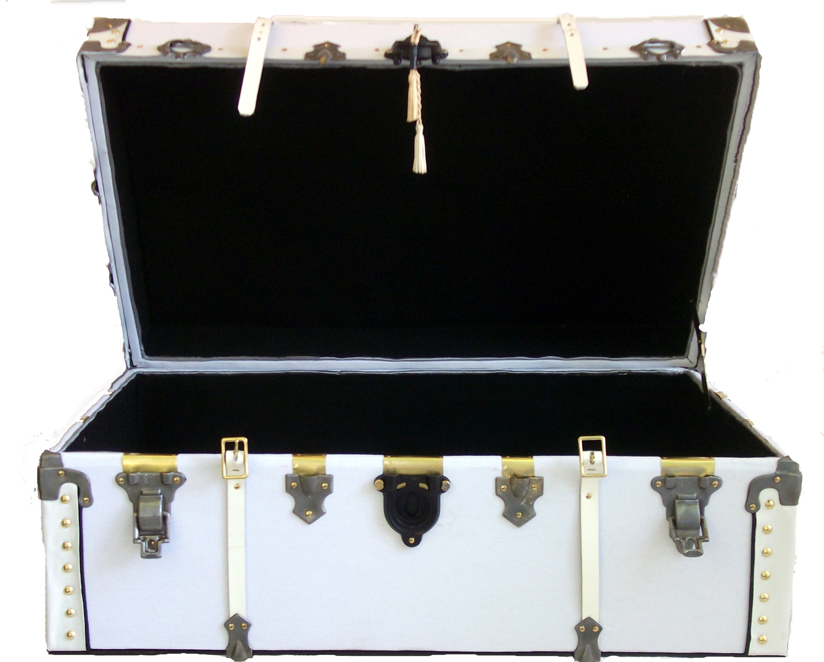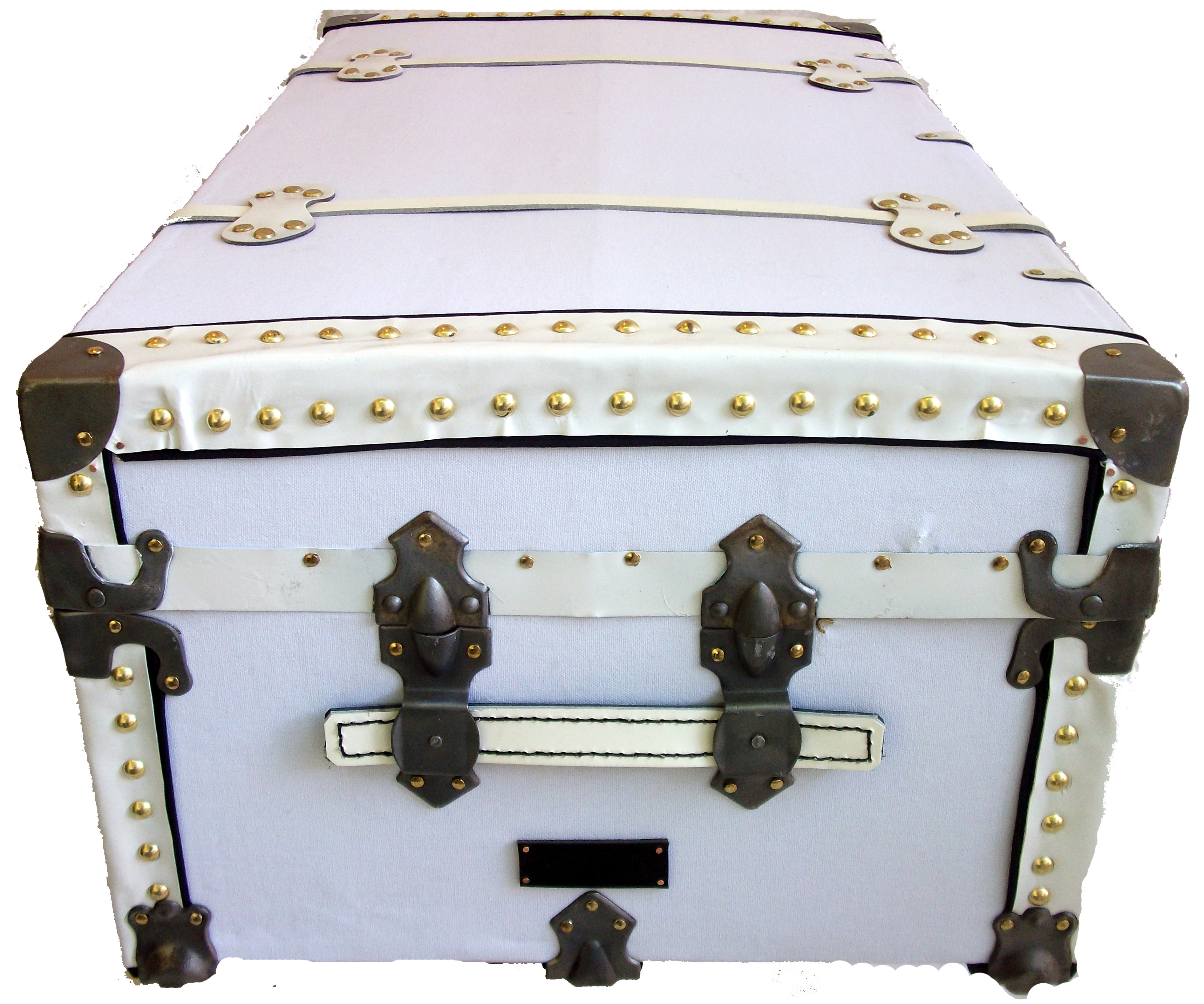 C. 1890 Steamer/Cabin trunk, recovered in bright white 100% canvas duck. White patent leather binding, custom hand-stitched leather side handles. Twin white leather belts with solid brass buckles. Refit with NOS EXCELSIOR working lock and key. All original hardware, metal bottom, hardwood slats. Lined in black cotton felt with edged piping.