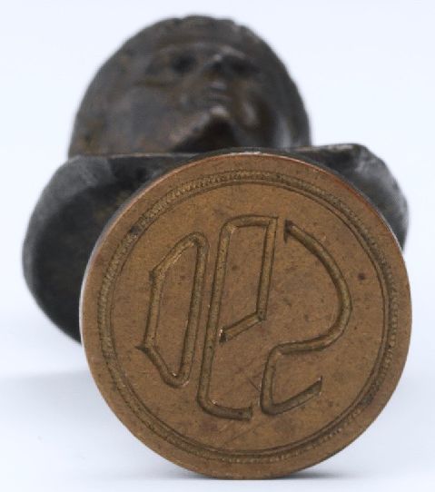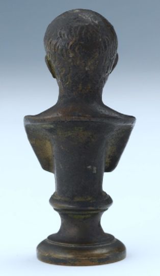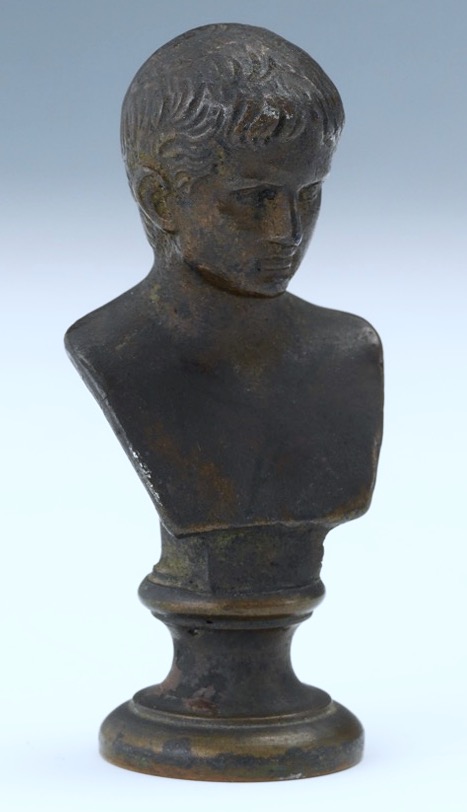 1294. Grand Tour Bronze Personal Seal Bust of Young Augustus Caesar after By Artist Pietro Bazzanti (Italian, 1842-1881), ca. 19th Century. Condition: Overall good, nice patina, some soils. Size 3” inches. Well done bronze cast bust with applied dark brown patina, raised on a socle base with carved letters underneath, depicting a bust of young Augustus Caesar, future first Roman Emperor. Bazzanti specialised in allegorical and genre subjects as well as copies of Antique and Renaissance sculpture. Regarded as one of the most talented sculptors of his day, his studio in Florence Italy became a center for other important sculptors such as Ferdinando Vichi, Cesare Lapini and Guglielmo Pugi. Caesar Augustus was born Gaius Octavius on September 23, 63 B.C., in Velletri, Italy. Julius Caesar, his great-uncle, took an interest in Augustus. When Julius Caesar was murdered, Augustus discovered that he was Julius's heir to the throne. Before Augustus could gain the throne, however, he was forced to battle the armies of both Cleopatra VII and Marc Antony, who had their own plans for power following Julius Caesar's death. Augustus was victorious, and during his rule as Egypt's first Roman emperor, the country was peaceful and prosperous under his rule. Augustus died on August 19, 14 A.D., in Nola.