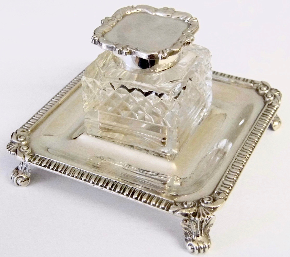 Made for European Victorian writing and drawing. A Superb Antique Edwardian Solid Silver Inkstand/Inkwell. This is a Superb Edwardian cut glass inkwell with a hinged solid silver lidWhich seats on to fine solid silver standBoth are hallmarked forLondon, date letter g/h, for 1902/3Maker "Charles Stuart Harris"Retail mark for Silver dealer " Lowe Chester" which is still running/open todayConditionIn very good condition with just a couple of very small nibbles to the glass high points on one corner, hardly noticeableThis item will be very securely wrapped & boxed when shipped. Size / Stand is approx 9.5cm square Complete weight approx 216 grams