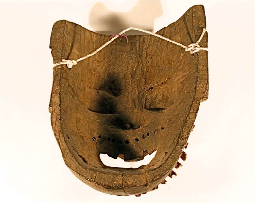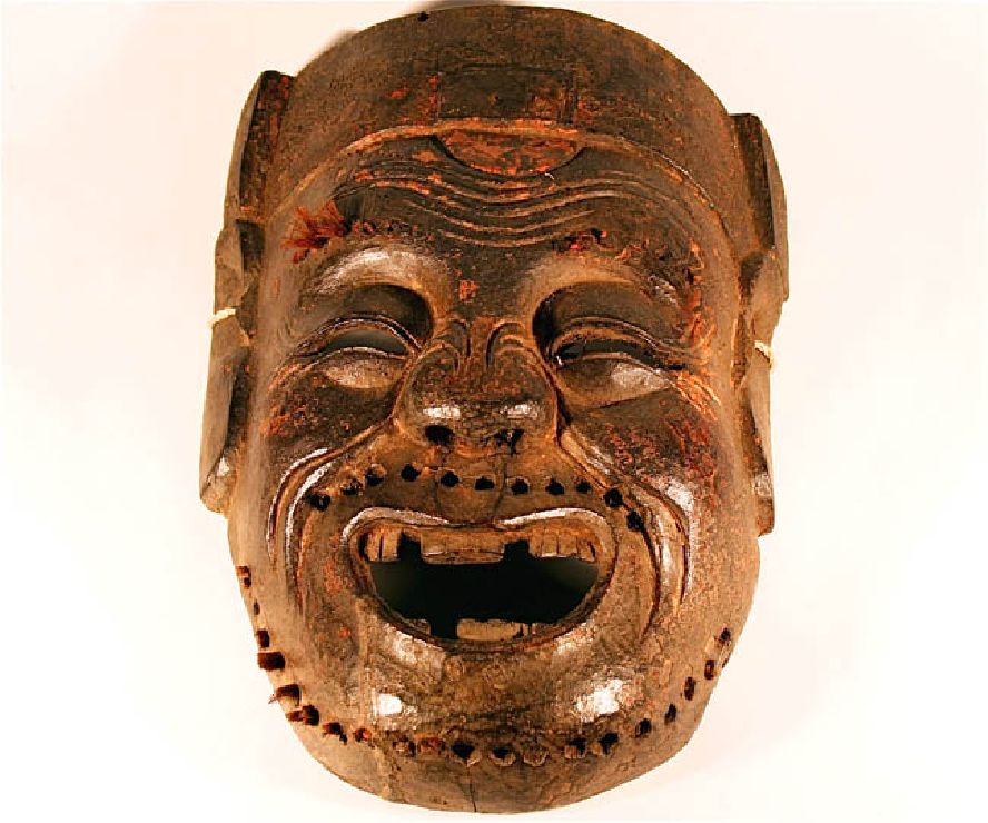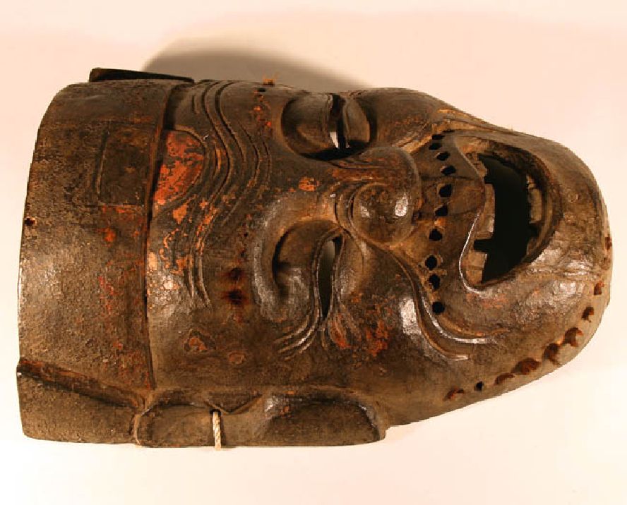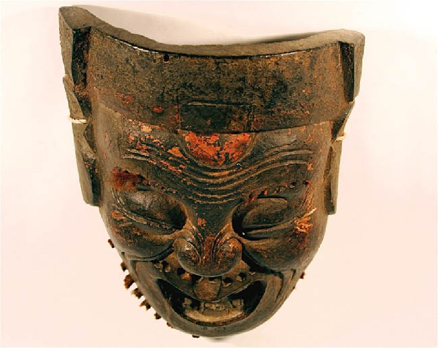 Antique, early 19th century, hand carved Chinese laughing Mask with Sichuan origins. Wooden hand carved theater mask in a dark natural patina with carved out eyes, with red human hair. The design and the position of the eyes and mouths give the feeling of a real strong presence. It is likely that this mask has never been repainted and shows it original brown and black patina with important areas exhibiting natural patina of use, which is rather unusual for Chinese mask. The piece shows some signs of use and is approximately 150 years old, and is in very good condition. Height: 10 inches and wide: 7 inches, Sichuan China