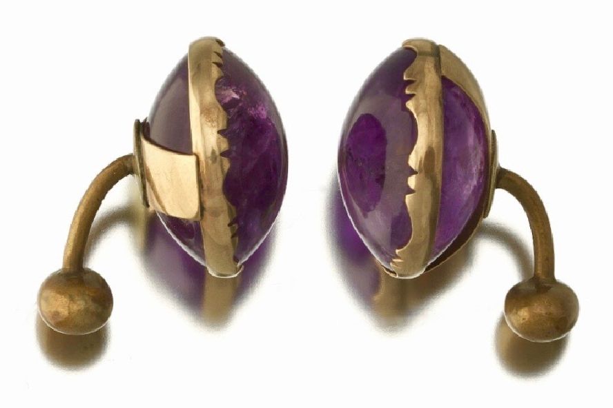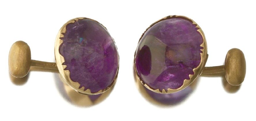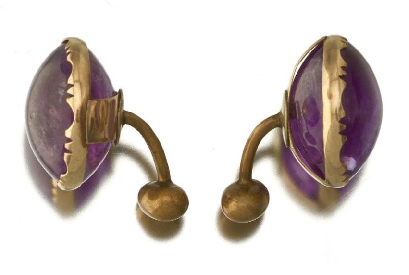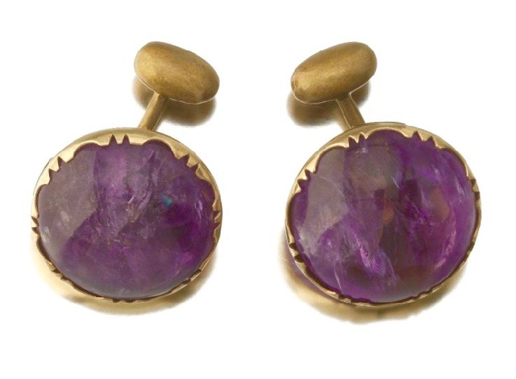 A beautifully handmade purple amethyst Pair of cufflinks. Size ⅞" x½" x 1 ¼" each 12k yellow gold and bronze pair of cufflinks, set with oversized round carved double cabochon purple amethyst, measuring 23 x 13.5 mm each; overall weight 24.8 gm. Condition: Good, nice patina, natural inclusions in stones; gold purity X-ray machine tested. Purple Amethyst has been highly esteemed throughout the ages for its stunning beauty and legendary powers to stimulate, and soothe, the mind and emotions. It is a semi-precious stone in today’s classifications, but to the ancients it was a “Gem of Fire,” a Precious Stone worth, at times in history, as much as a Diamond. It has always been associated with February, the month the Romans dedicated to Neptune, their water-god, and is the traditional birthstone of that month. It is the stone of St. Valentine and faithful love, and signifies ecclesiastical dignity as the Bishop’s Stone. It carries the energy of fire and passion, creativity and spirituality, yet bears the logic of temperance and sobriety. In today’s world, Amethyst is still a remarkable stone of spirituality and contentment, known for its metaphysical abilities to still the mind and inspire an enhanced meditative state. Its inherent high frequency purifies the aura of any negative energy or attachments, and creates a protective shield of Light around the body, allowing one to remain clear and centered while opening to spiritual direction. Amethyst stimulates the Third Eye, Crown and Etheric Chakras enhancing cognitive perception as well as accelerating the development of intuitive and psychic ability. It initiates wisdom and greater understanding, and is a stone of comfort for those grieving the loss of a loved one.