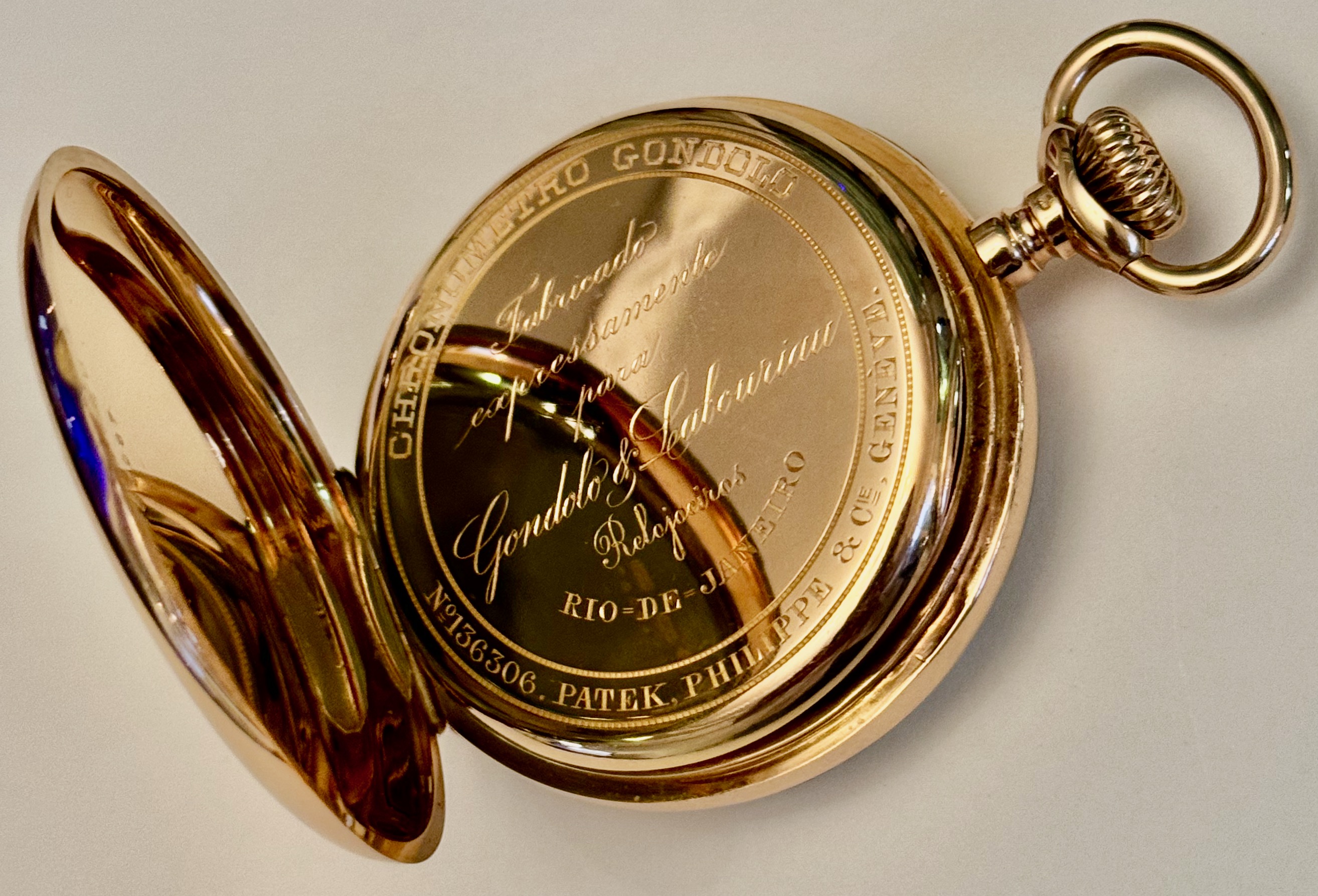 Gold Pocket Watch - Patek Philippe and C-ie Genève / Chronometro Gondolo Model: Patek Philippe Chronometro Gondolo (circa ?) Type: Vintage/Antique Men’s Pocket Watch Size: 51mm Material: 18K Rose Gold One of the most renowned models of Patek Philippe pocket watches, the Chronometro Gondolo, was sold exclusively by Gondolo & Labouriau, a prominent jeweler in Rio de Janeiro. Utilizing an innovative marketing strategy, these watches feature enhanced technical elements that highlight Patek Philippe's exceptional watchmaking expertise. This line was associated with Gondolo & Labouriau, a luxury watch retailer in Rio de Janeiro. The partnership between Patek Philippe and Gondolo & Labouriau lasted from 1872 to 1927 and was instrumental in establishing the Patek Philippe brand in South America. The Chronometro Gondolo watches were known for their precision and high-quality craftsmanship. They were designed with a simplicity and elegance that made them stand out, typically featuring a gold case, minimalist dials, and finely crafted movements. Each piece was regulated to meet exacting standards and was stamped with the "Chronometro Gondolo" designation, reflecting its status as a top-tier timepiece. The Chronometro Gondolo line remains one of Patek Philippe's most collectible models, revered for its historical significance, beauty, and rarity. Today, these watches are highly sought after by collectors who value both the craftsmanship and the story of Patek Philippe's early expansion. Patek Philippe's Chronometro Gondolo pocket watches exemplify Swiss horological excellence and serve as a testament to the brand's history of creating timepieces for the world’s elite collectors. Condition: This is a pre-owned item and may display minor signs of cosmetic wear. However, it remains fully operational and functions as intended. Specifications: Department: Men Case Material: 18K Yellow Gold Style: Luxury Brand: Patek Philippe Gender: Men’s Hands: Feuille hands Function: Sub Seconds, No Date Dial Color: White Overall Condition: Very Good This is a distinguished piece for collectors or those who appreciate timeless craftsmanship.