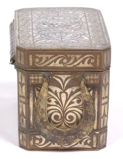 Absolutely beautiful! This is an incredibly large and heavy Silver and bronze box. Mindanao Cast Bronze and Silver Betel Nut Box 9" x 4" x 4 ½" / 19th c., Philippines, rectangular with canted corners and hinged lid, overall floral design, the interior fitted with four conforming hinged lidded compartments. Carved horseshoe shaped handles. Condition: Good, some wear from age, oxidation. The box has virtually no inlay loss, The Betel nut is a mild stimulant that is chewed throughout Asia. / The betel palm ( found primarily in Asian countries ) yields a seed known as the betal nut. The dark nut is often wrapped in a betel leaf and flavored with lime. Menginang tradition or chewing betel nut is widespread among Indonesian ethnic groups, especially among the Javanese, Balinese and Malay people; dating back to more than 3000 years.[15] Records of travelers from China showed that betel and areca had been consumed since the 2nd century BCE. It is a tradition in South India and nearby regions to give two Betel leaves, areca nut (pieces or whole) and Coconut to the guests (both male and female) at any auspicious occasion. Even on a regular day it is the tradition to give a married woman, who visits the house, two Betel leaves, areca nut and coconut or some fruits along with a string of threaded flowers. This is referred to as tambolam. In a 16th-century cookbook, Nimmatnama-i Nasiruddin-Shahi, describes Ghiyas-ud-din Khalji, the Sultan of Mandu (r. 1469–1500), watches as tender betel leaves of the finest quality are spread out and rosewater is sprinkled on them, while saffron is also added. An elaborate betel chew or paan would contain fragrant spices and rose preserves with chopped areca nuts.