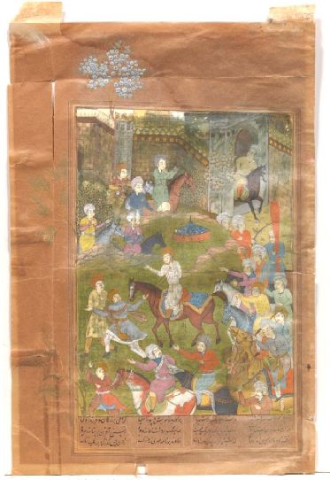 Illuminated Manuscript Page 13 ½" x 9 ½" Skillfully painted manuscript page depicting an equestrian scene, gouache on paper with gold pigments, surrounded by hand-lettered notations and florals in the margins, the verso with script and notations, unframed. less / Condition: Paper is stained, previous exposure to moisture, brittle edges separating, water staining, old adhesive verso. Recent scholarship has noted that, although surviving early examples are now uncommon, human figurative art was also a continuous tradition in Islamic lands in secular contexts (such as literature, science, and history); as early as the 9th century, such art flourished during the Abbasid Caliphate (c. 749-1258, across Spain, North Africa, Egypt, Syria, Turkey, Mesopotamia, and Persia). The work was often divided between the main painter, who drew the outlines, and less senior painters who coloured in the drawing. In Mughal miniatures at least, a third artist might do just the faces. Then there might be the border paintings; in most books using them these are by far the largest area of painted material as they occur on text pages as well. The miniatures in a book were often divided up between different artists, so that the best manuscripts represent an overview of the finest work of the period. The scribes or calligraphers were normally different people, on the whole regarded as having a rather higher status than the artists - their names are more likely to be noted in the manuscript.