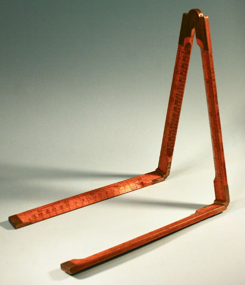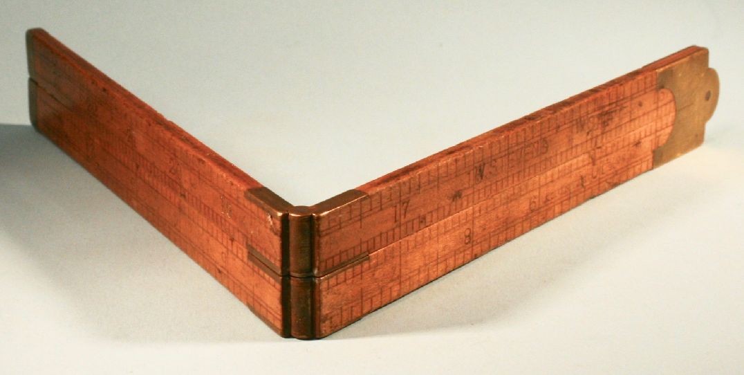 A rare antique beveled edge ruler / Antique Articulated Folding Brass & Wood Ruler Calculation Aid Tool / Retractable flexible rule or tape measure. A ruler can be defined as a tool or device used to measure length and draw straight lines. Rulers can be used to measure lengths in both metric and customary units. Here, the ruler is marked in centimeters (cms) along the top and in inches along the bottom. The marks or intervals on a ruler are called hash marks. A long folding wooden strip with linear-measurement markings. It is a common measuring tool in its day.