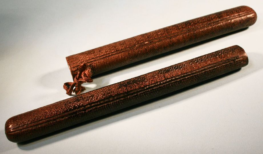 A wonderful example of the tradition from generation to generation using weaving skills. The art of woven baskets and vessels / This was made for an artisan. A wonderful Asian Japanese woven wicker Leather scroll tube box for documents or tool instruments. The Top slides over the cylinder tightly. Absolutely gorgeous patina. Incredible craftsmanship. Each piece began as an ordinary piece of work, sourced locally and in abundance. transforming the raw ingredient into a work of art that requires a lot of attention to detail and a special skill-set of tools and techniques. recognition of the value of this craft has enabled local craftsmen to hone their skills, experiment with new designs and develop their own distinct styles. meanwhile, the commitment to continuous development and training of the master-apprentice training combined with a modern teaching system, help ensure that Japanese craftsmanship will continue to thrive in the contemporary world.