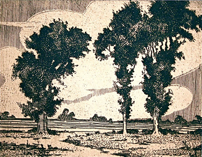 Title: Framed Metal Engraving Landscape With Three Large Trees