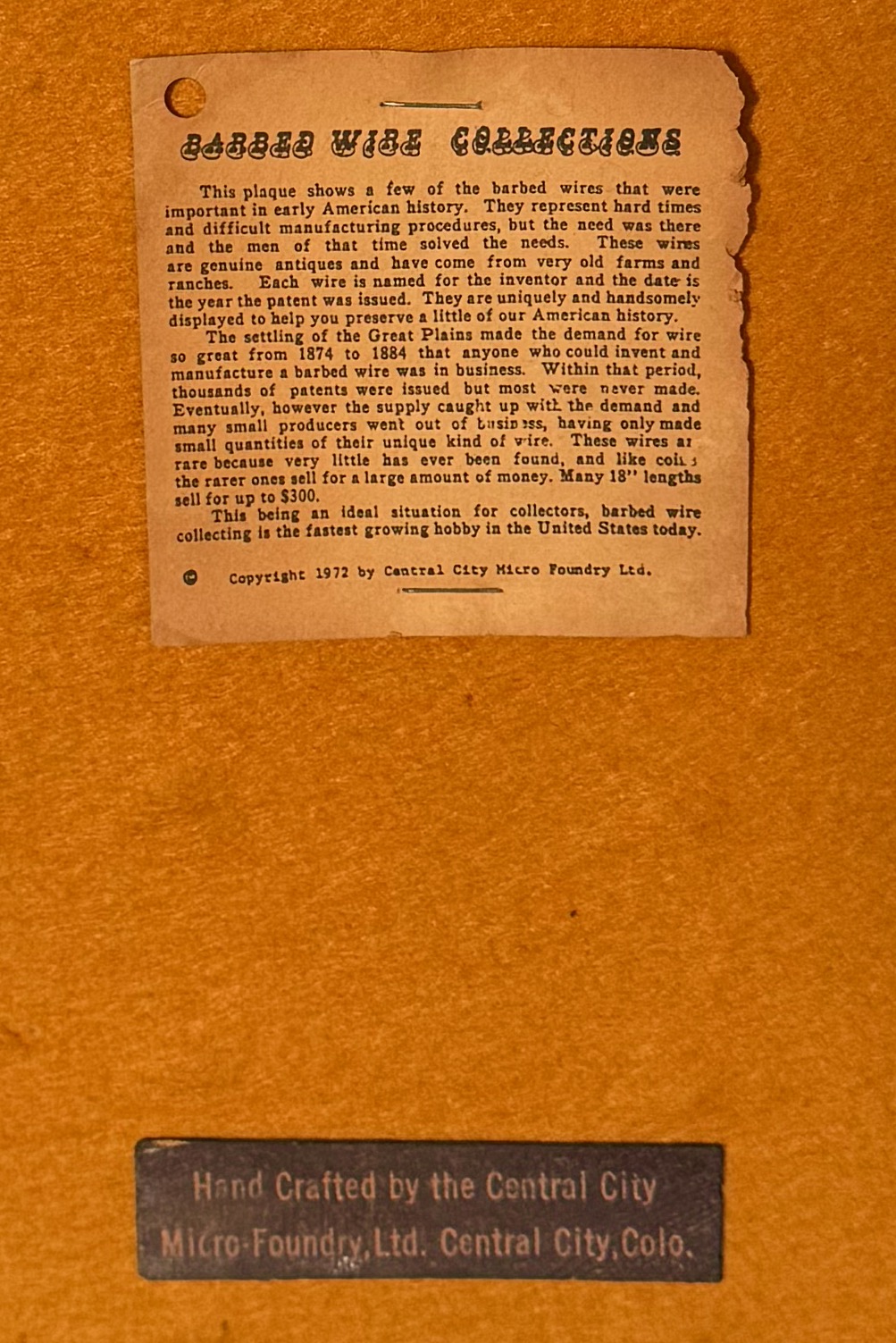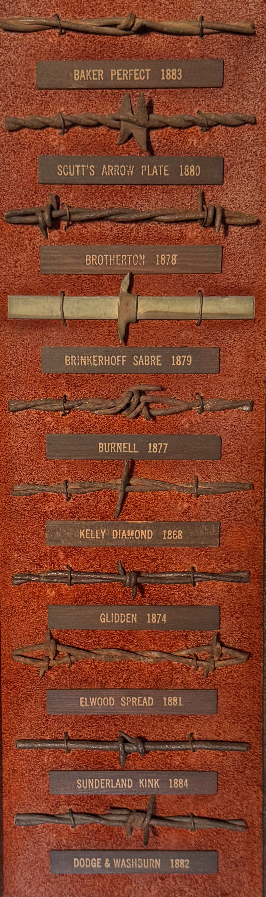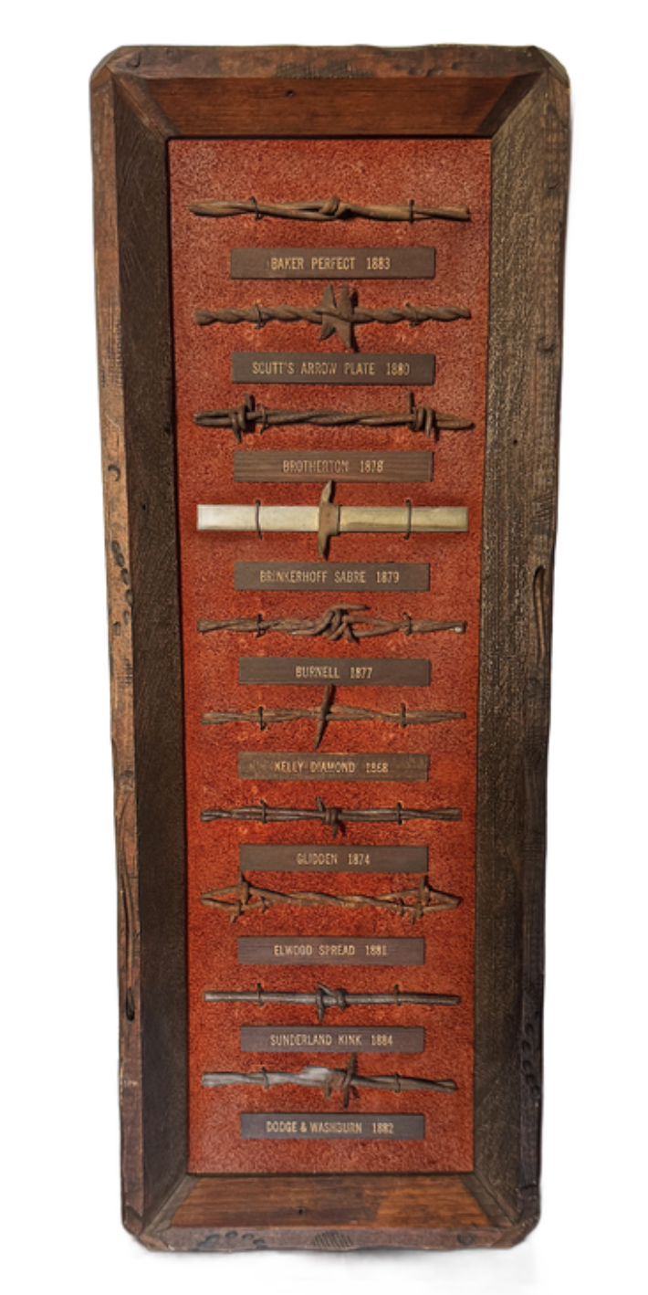 Devils Rope: A remarkable collection of ten antique, rare barbed wires, carefully mounted on leather and framed in one handcrafted folk art wooden frame. Each wire displays its unique patent date, showcasing the ingenuity of the 1800s in the United States. This rare and spectacular collection represents a piece of history, highlighting the evolution of barbed wire manufacturing. Approximate dimensions: 18" x 6 3/4”. A perfect addition for collectors or history enthusiasts! Barbed wire, often called "Devil's Rope," has been a vital tool since its invention in the 19th century. In the 1800s, it revolutionized land management by providing an affordable and efficient way to fence large tracts of land, especially on the open plains, enabling farmers and settlers to protect crops and livestock while transforming the American West. During the 1900s, barbed wire extended beyond agriculture, playing a significant role in military applications such as trench warfare during World War I and securing boundaries in prisons and industrial sites. Today, barbed wire remains a practical solution for fencing in rural areas, but it has also taken on symbolic and artistic significance, reflecting themes of confinement, protection, and historical ingenuity.