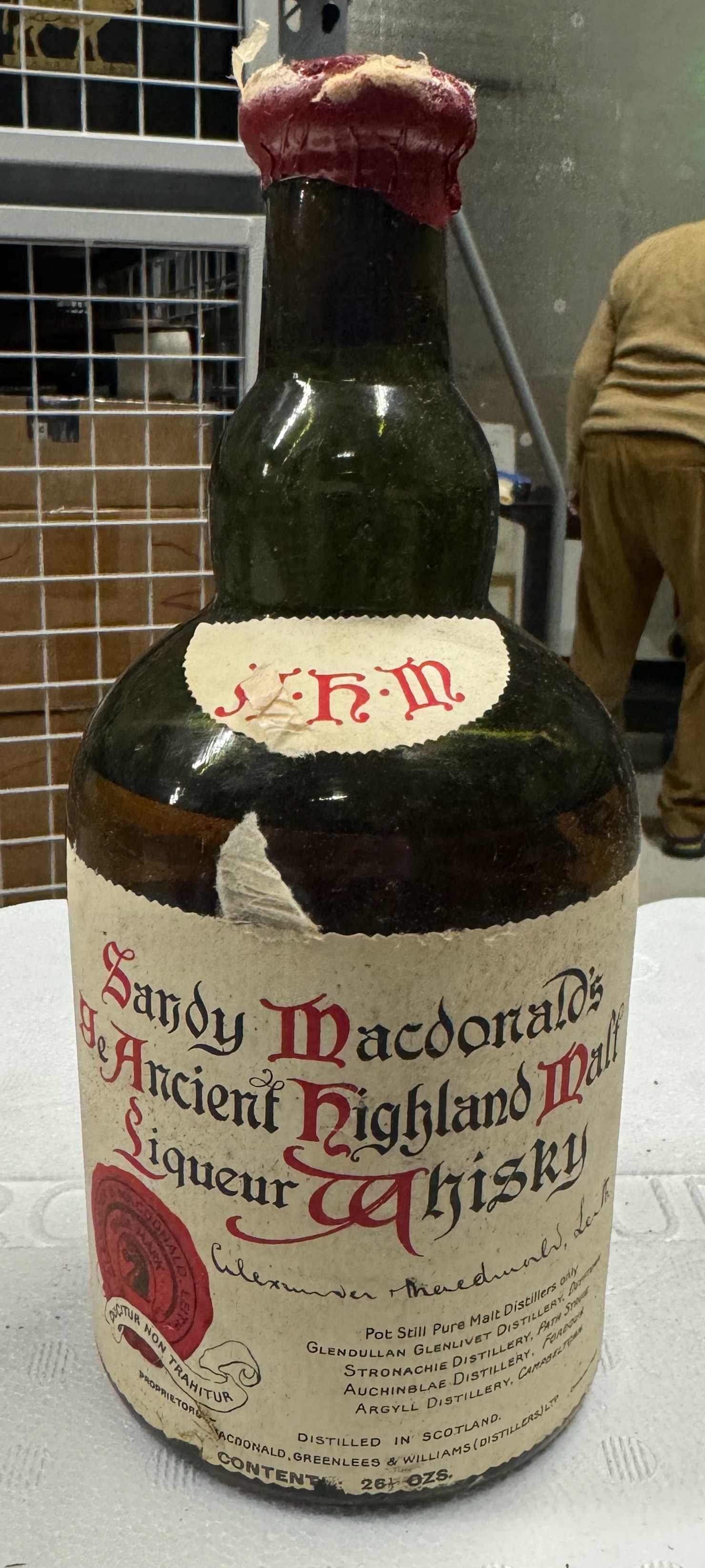 Very Rare Alcohol: Sandy Macdonald's Ye Ancient Highland Malt Liqueur Whisky. Recently sold at auction for $1,682 USD, this bottle of whisky is a phenomenal piece of Scotch whisky history. Containing whisky dating back to 1923, it includes contributions from distilleries that have long since disappeared. This extremely rare blend was produced under the Sandy Macdonald label by Macdonald Greenlees, featuring whiskies exclusively from the following distilleries: Glendullan-Glenlivet, Stronachie, Auchinblae, and Argyll. Of these, only Glendullan remains in operation today. The back label "guarantees" that the whiskies are of "pre-war quality and strength". While the exact strength is not stated, this likely places the bottling in the late 1940s to early 1950s. With a capacity of 26 ½ ounces—a charming and quaint detail—the bottle shows some wear to the label but remains in excellent condition for its age. Please note that all spirits are sold for collection by specialized carriers. * Disclaimer for Sale of Antique Alcohol: This bottle is sold solely as a collectible item and is not intended for consumption. The contents are over 100 years old and may no longer be suitable for drinking. The buyer and seller assume all responsibility for any risks associated with consuming the contents. This consignment sale complies with all applicable state and federal laws concerning the sale and transfer of alcoholic beverages. The buyer affirms they are at least 21 years of age and acknowledges that this product is sold exclusively as a collectible item. The transaction will be handled directly between the owner and buyer. Busacca Gallery will not be involved in the transaction unless a licensed broker is engaged. * Regulatory Compliance: Antique alcohol, defined as alcohol over 50 years old, may be sold in California, subject to state and federal regulations. The buyer’s legal drinking age (21 or older) must be verified. These items are sold primarily for their collectible value, not for consumption. If it is determined that the alcohol is being purchased for consumption, a licensed broker will be engaged to complete the transaction. * Recommendation: Busacca Gallery recommends that sellers consult with a legal professional or an expert in alcohol sales regulations to ensure compliance with all applicable laws.