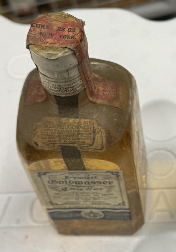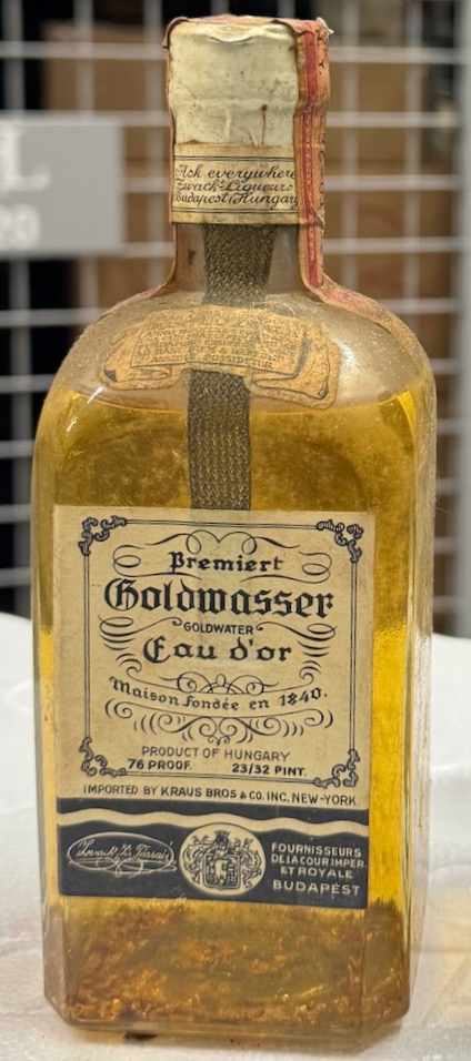 Vintage Premium Goldwasser (Goldwater) Mini Liquor Bottle - Still Sealed with Gold Flakes. Vintage Bremiert Goldwasser Liquor - Maison Fondée en 1840. Goldwasser (Gold Water): A Historical Liquor Origins and Early History Goldwasser, a unique herbal liqueur containing suspended flakes of 24-karat gold, dates back to the 16th century. It is believed to have originated in the city of Danzig (modern-day Gdańsk, Poland), which was a thriving port and a center of trade during that period. The drink is traditionally known as Danziger Goldwasser (Gdańsk Goldwater). The liqueur was first created in 1598 by a Dutch distiller named Ambrosius Vermöllen, who moved to Danzig and opened a distillery. Vermöllen's recipe combined over 20 different herbs, roots, and spices with the striking addition of edible gold flakes, making it a luxury drink symbolizing wealth and opulence. The Significance of Gold, In the 16th century, gold was believed to have medicinal properties, including the ability to rejuvenate the body and strengthen the heart. Suspended gold flakes in the liqueur gave Goldwasser its signature appearance and elite status among European nobility and merchants. It quickly became associated with celebration, luxury, and health. The Recipe Goldwasser is a clear herbal liqueur with a strong and sweet taste, often featuring flavors of: Cinnamon, Cloves, Anise, Lavender, Cardamom, The gold flakes do not dissolve but remain suspended in the bottle, providing a striking visual appeal. Please note that all spirits are sold for collection by specialized carriers. * Disclaimer for Sale of Antique Alcohol: This bottle is sold solely as a collectible item and is not intended for consumption. The contents are over 100 years old and may no longer be suitable for drinking. The buyer and seller assume all responsibility for any risks associated with consuming the contents. This consignment sale complies with all applicable state and federal laws concerning the sale and transfer of alcoholic beverages. The buyer affirms they are at least 21 years of age and acknowledges that this product is sold exclusively as a collectible item. The transaction will be handled directly between the owner and buyer. Busacca Gallery will not be involved in the transaction unless a licensed broker is engaged. * Regulatory Compliance: Antique alcohol, defined as alcohol over 50 years old, may be sold in California, subject to state and federal regulations. The buyer’s legal drinking age (21 or older) must be verified. These items are sold primarily for their collectible value, not for consumption. If it is determined that the alcohol is being purchased for consumption, a licensed broker will be engaged to complete the transaction. * Recommendation: Busacca Gallery recommends that sellers consult with a legal professional or an expert in alcohol sales regulations to ensure compliance with all applicable laws.
