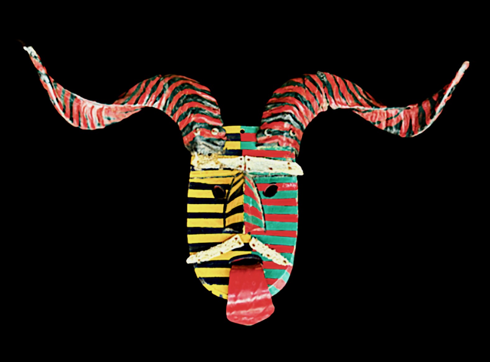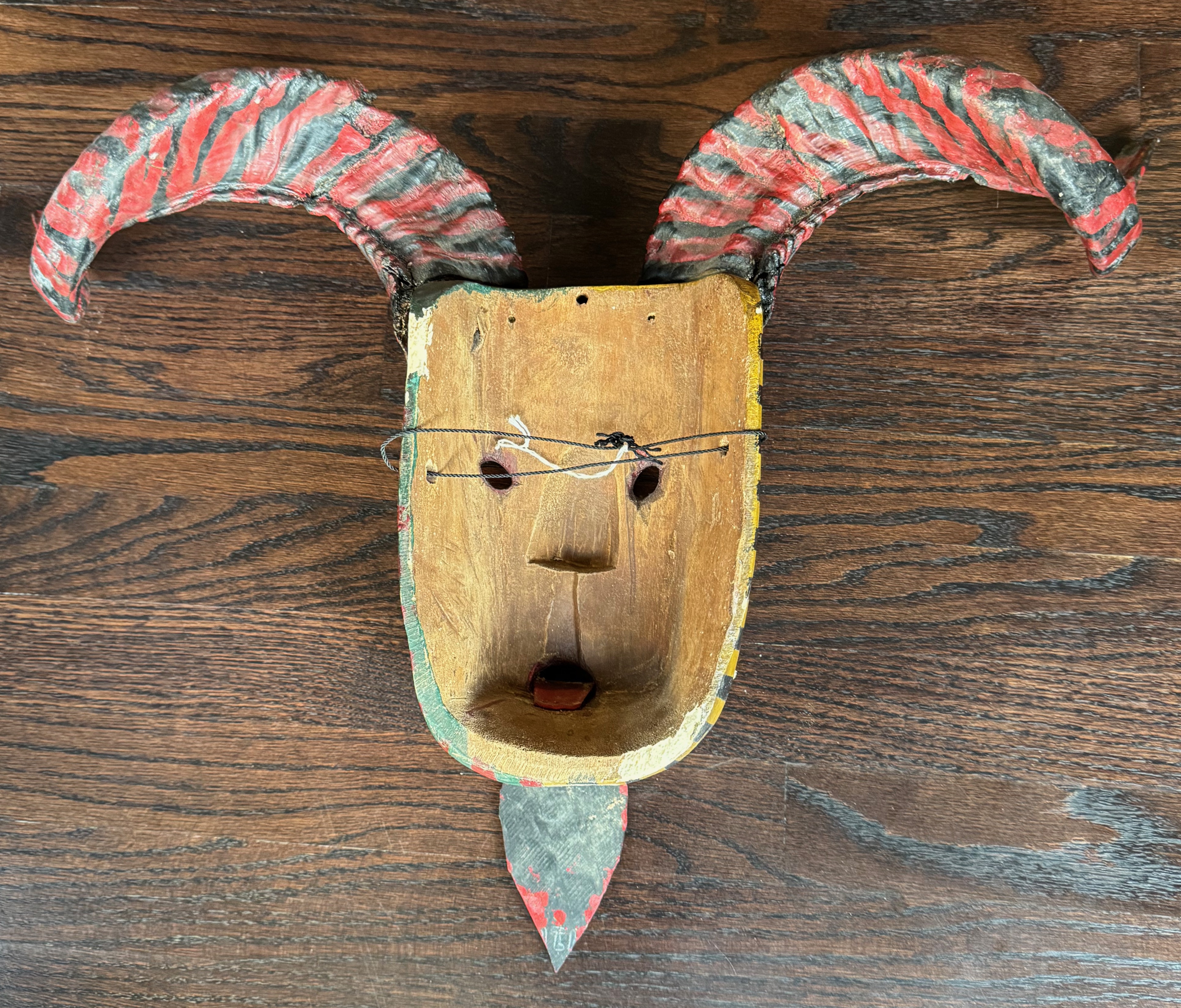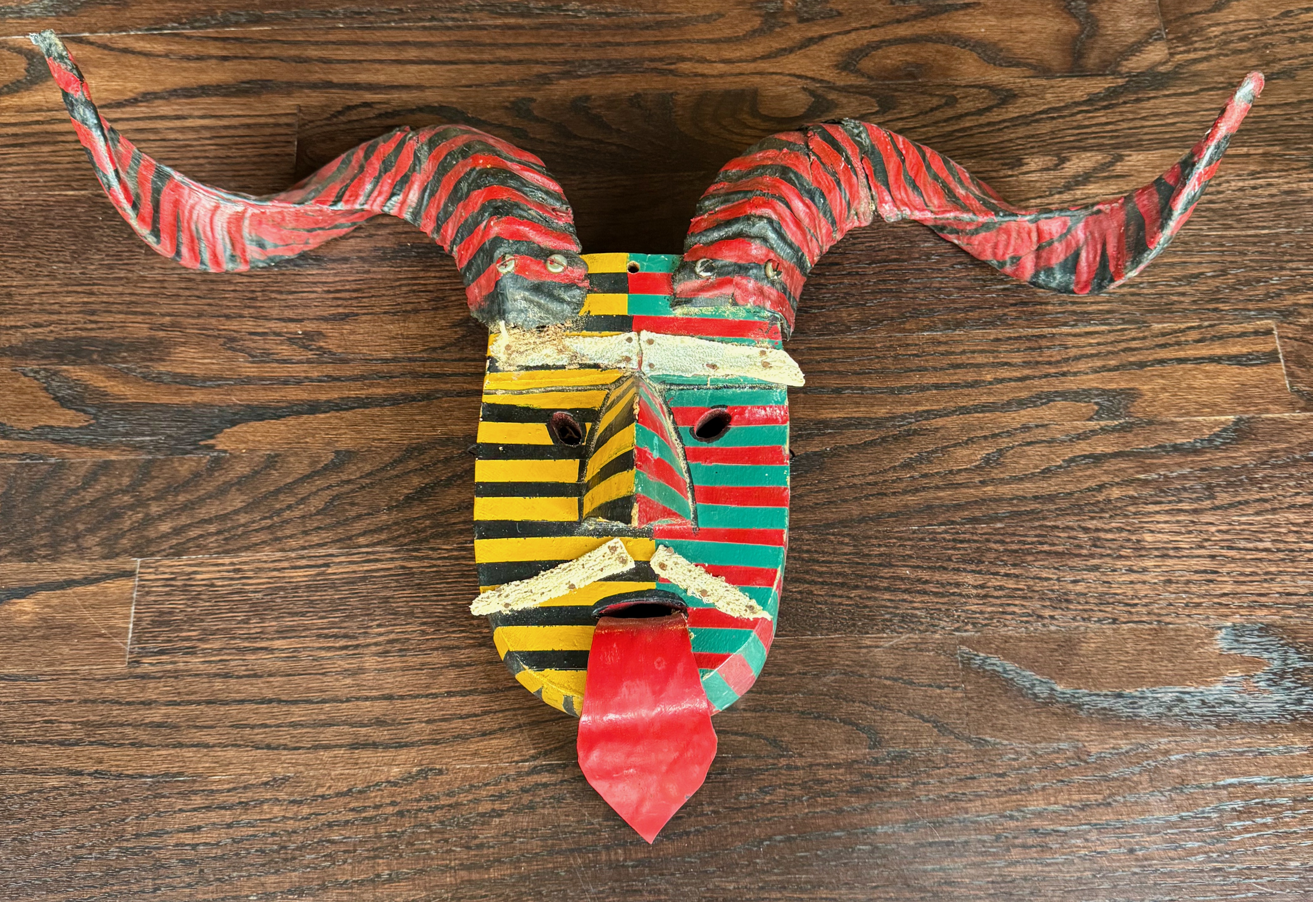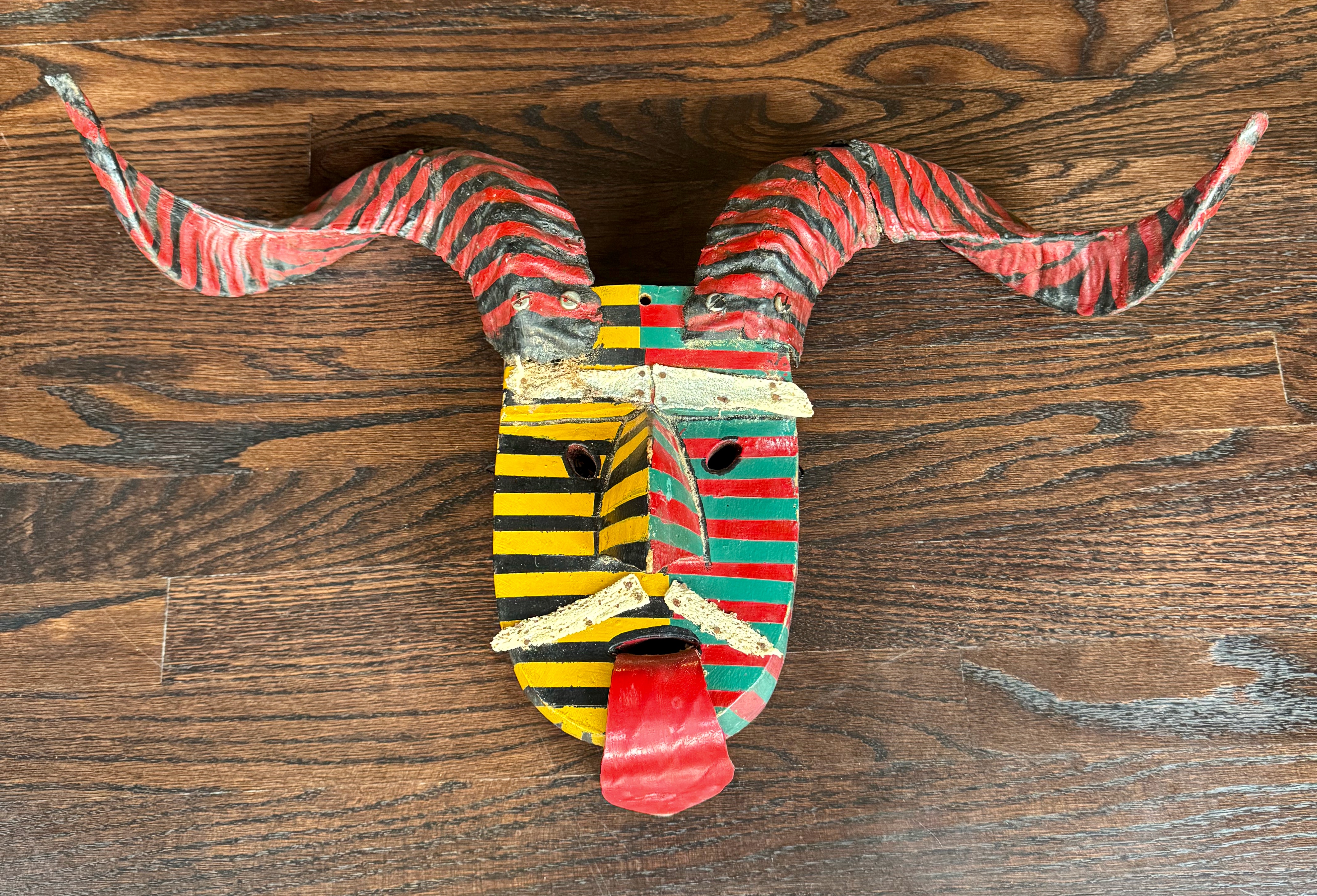 Fabulous 20th-century Mexican antique Arts and Crafts carnival mask, hand-carved from wood with goat horns, a red tongue, and vibrant, original painted geometric details crafted from found objects. Approximate size 24 inches wide 14 inches tall. This remarkable antique mask, featuring goat horns and vivid painted designs, is a testament to the rich Mexican tradition of Carnival. The festival, eagerly anticipated each year, serves as a vibrant celebration where people express their religious devotion and cultural heritage through dance, religion, culture, and art. The history of religious carved mask-making in Mexico is deeply rooted in the blending of indigenous traditions and Catholic influences brought by Spanish colonization. Pre-Columbian cultures, such as the Maya and Aztecs, used masks in religious rituals to honor deities, celebrate agricultural cycles, and depict mythological stories. With the arrival of the Spanish, indigenous artisans adapted their techniques to create masks for Catholic festivals, such as the Day of the Dead and Carnival, incorporating Christian iconography alongside traditional designs. These masks, often carved from wood and painted with vibrant colors, served as tools for storytelling, performance, and cultural expression. Today, they remain a symbol of Mexico's rich spiritual and artistic heritage, celebrated in traditional dances and ceremonies across the country.