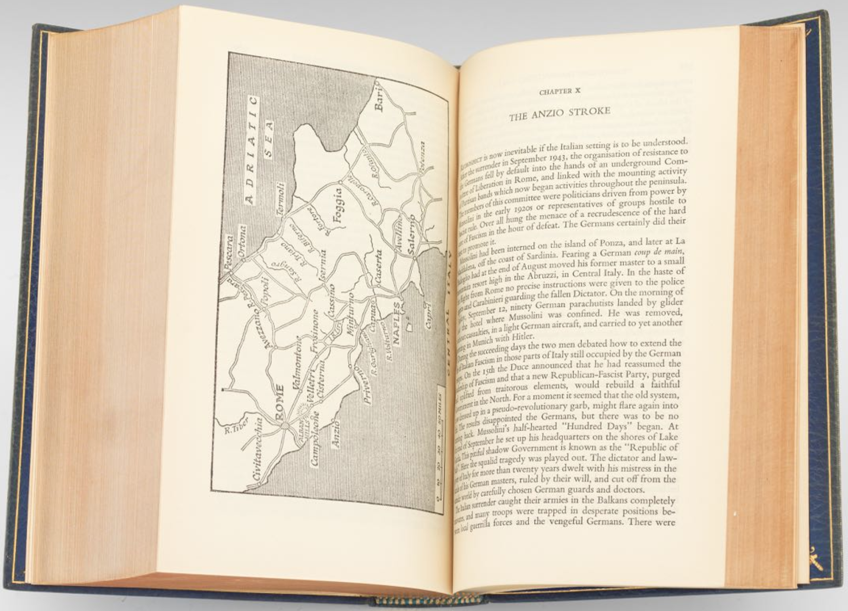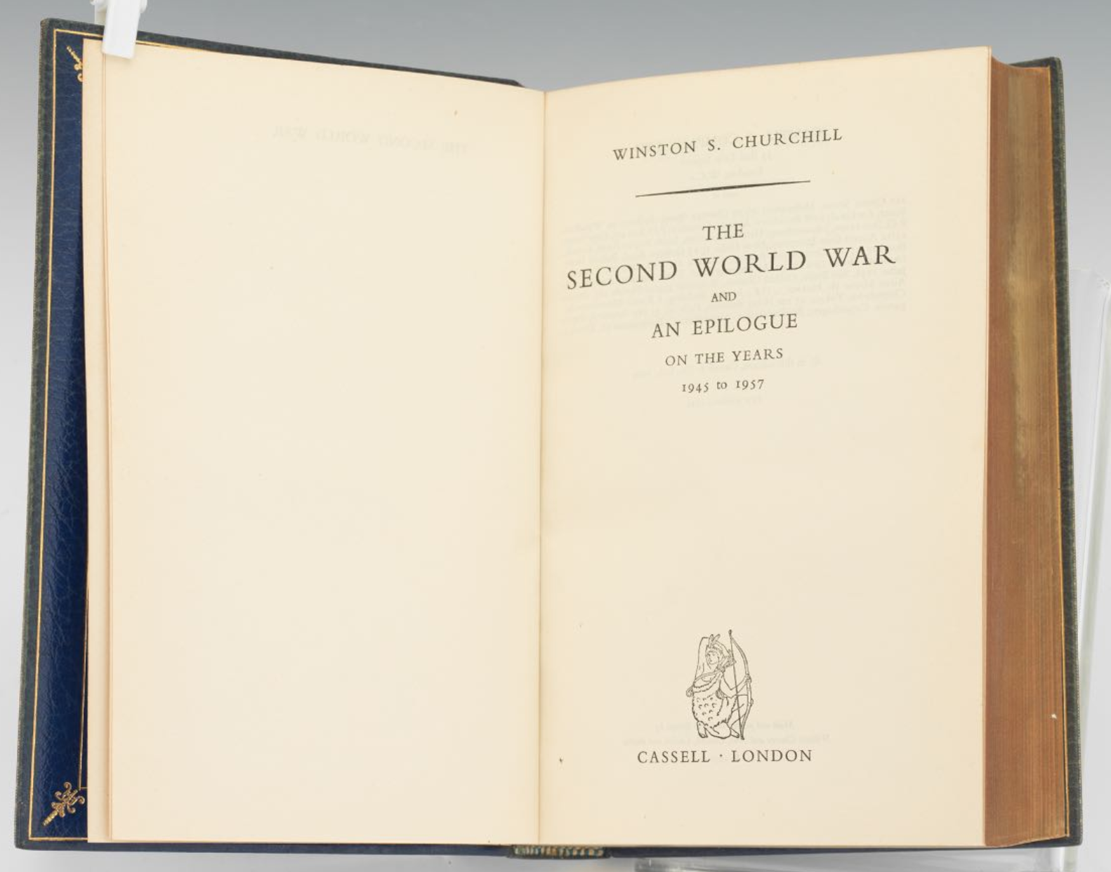 "The Second World War and an Epilogue on the years 1945 to 1957", Winston S. Churchill, an Abridgment by Denis Kelly, Bound By Bayntun London: Cassell, 1959. First edition. 8 vo. Bound by Bayntun (Riviere) binding, full blue leather with gilt tooling, five raised bands with gilt decorative spine, marbled end papers, gilt ruled edges. 1033 pp.Illustration throughout with maps.