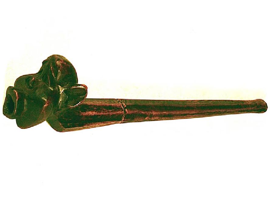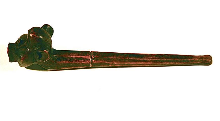 Vintage hand carved hash pipe, circa 19th Century We are offering a vintage pipe with no marks. The bowl is deeply carved with a head carving within the design. Tip of stem is discolored. A patina has developing on the wood where there is darkening and polishing from holding. The wood is in great condition.